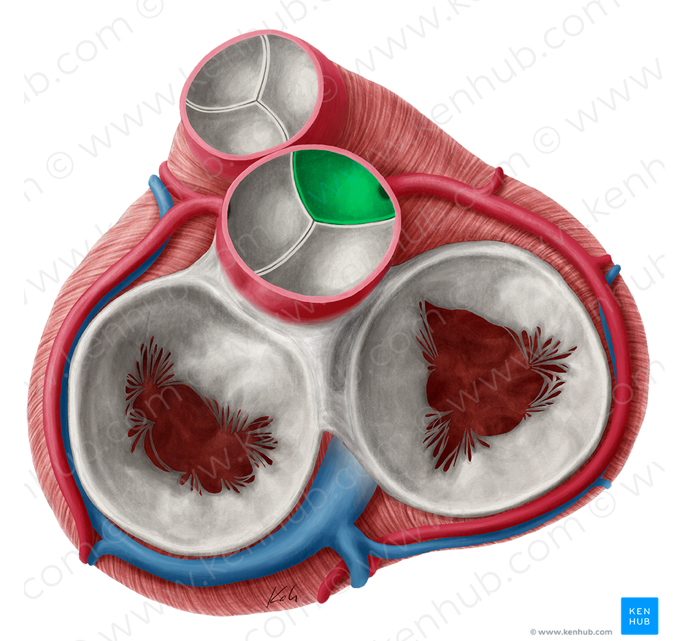 Shown from superior perspective. Also known as Right semilunar leaflet of aortic valve, and Right coronary cusp of aortic valve.