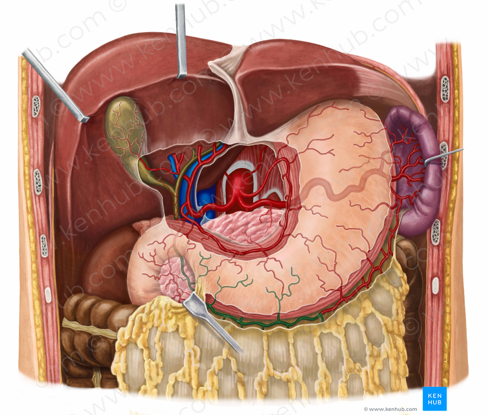 Shown from anterior perspective. Also known as Right gastroepiploic artery.