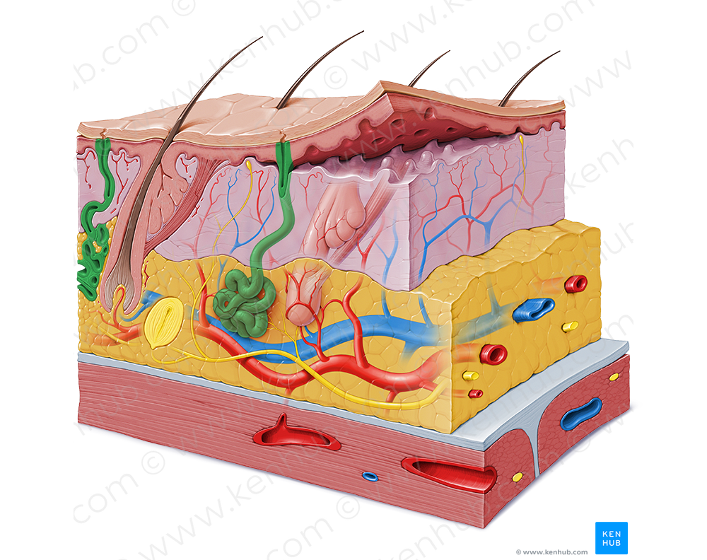 Shown from axial perspective. Also known as Sudoriferous gland, and Eccrine sweat gland.