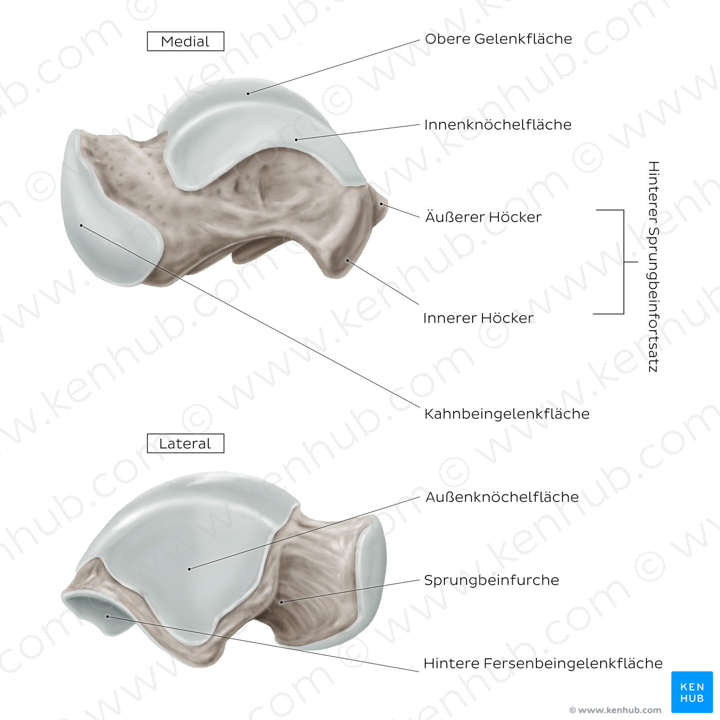 Die Kahnbeingelenkfläche des Sprungbeinkopfes ist am besten in medialer Ansicht zu sehen. Wie der Name verrät, artikuliert sie mit der Gelenkfläche des Kahnbeins und bildet das Sprungbein-Kahnbein-Gelenk. In der lateralen Ansicht sehen wir die Sprungbeinfurche, die zusammen mit der Rinne des Fersenbeins die Fußwurzelhöhle bildet. An der medialen und lateralen Oberfläche des Sprungbeinkörpers befinden sich zwei Gelenkflächen - Innenknöchelfläche und Außenknöchelfläche des Sprungbeins, die mit den Gelenkflächen des Innenknöchels und des Außenknöchels artikulieren. Lateral der Rolle des Sprungbeins befindet sich die konkave, dreieckige Außenknöchelfläche des Sprungbeins. Medial der Rolle des Sprungbeins befindet sich die halbmondförmige Innenknöchelfläche des Sprungbeins. Der innere und der äußere Höcker des hinteren Sprungbeinfortsatzes dienen als Ansatzpunkte für das innere Sprungbein-Fersenbein-Band, das äußere Sprungbein-Fersenbein-Band und das hintere Sprungbein-Wadenbein-Band.
