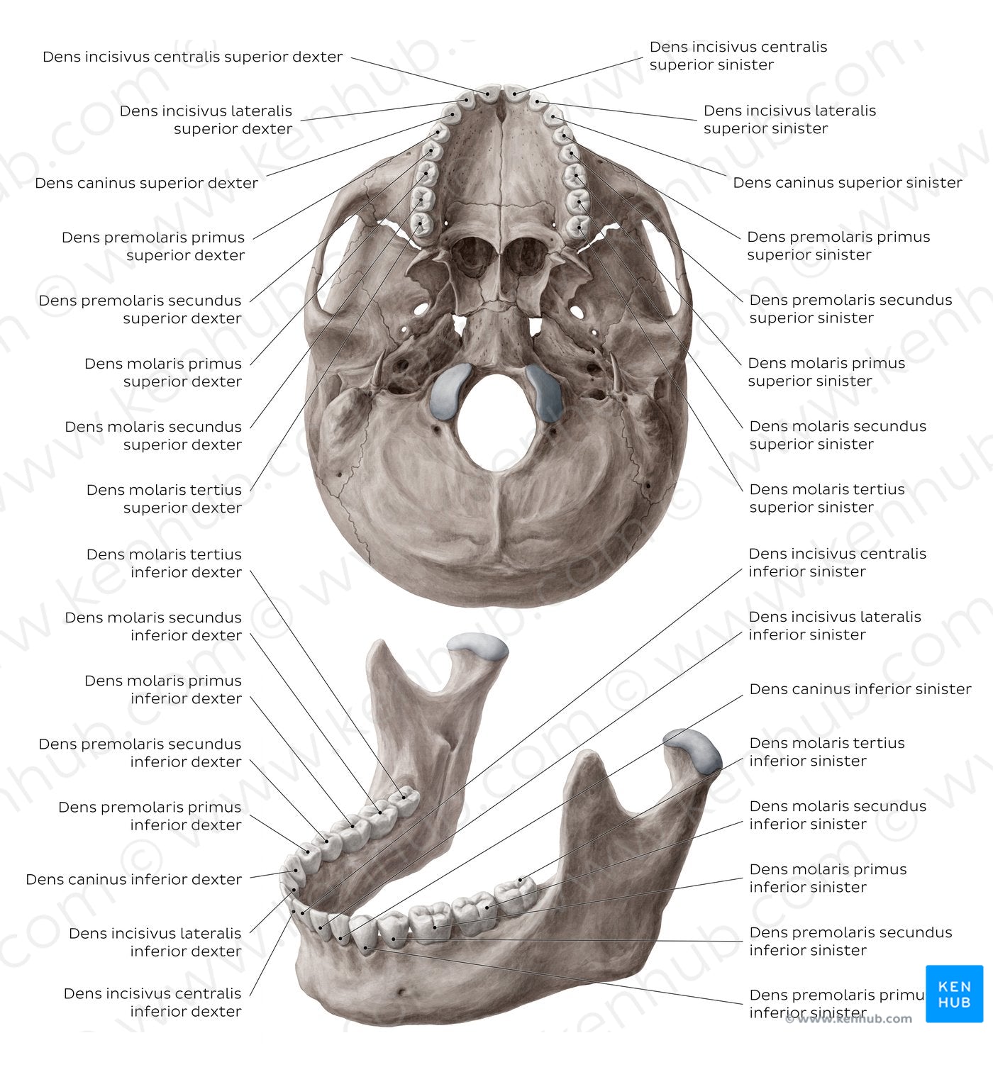 Overview of the dentes permanentes with all 32 teeth: 16 dentes maxillares/superiores and 16 dentes mandibulares/inferiores. There are 8 teeth in each quadrant where each tooth has a different function based on their anatomy. There are 8 dentes incisivi in total, (4 maxillary and 4 mandibular), in the front and center of the mouth which are often described as chisel-shaped. These teeth function to cut or bite into food. The dentes canini number 4 in total, 1 in each quadrant, each bearing a sharp cusp used to tear food (especially fibrous foods such as meat), giving them their pointed appearance. The dentes premolares are 8 in number (2 in each quadrant) and are used to help canines to tear food. These teeth also have occlusal surfaces which help with the grinding of food. The dentes molares are the largest members of the dentition; they consist of 12 teeth (3 in each quadrant) which are used to crush and grind food due to their larger occlusal (chewing) surfaces. The dentes premolars and molars are often described as large, rectangular, diamond-shaped teeth.