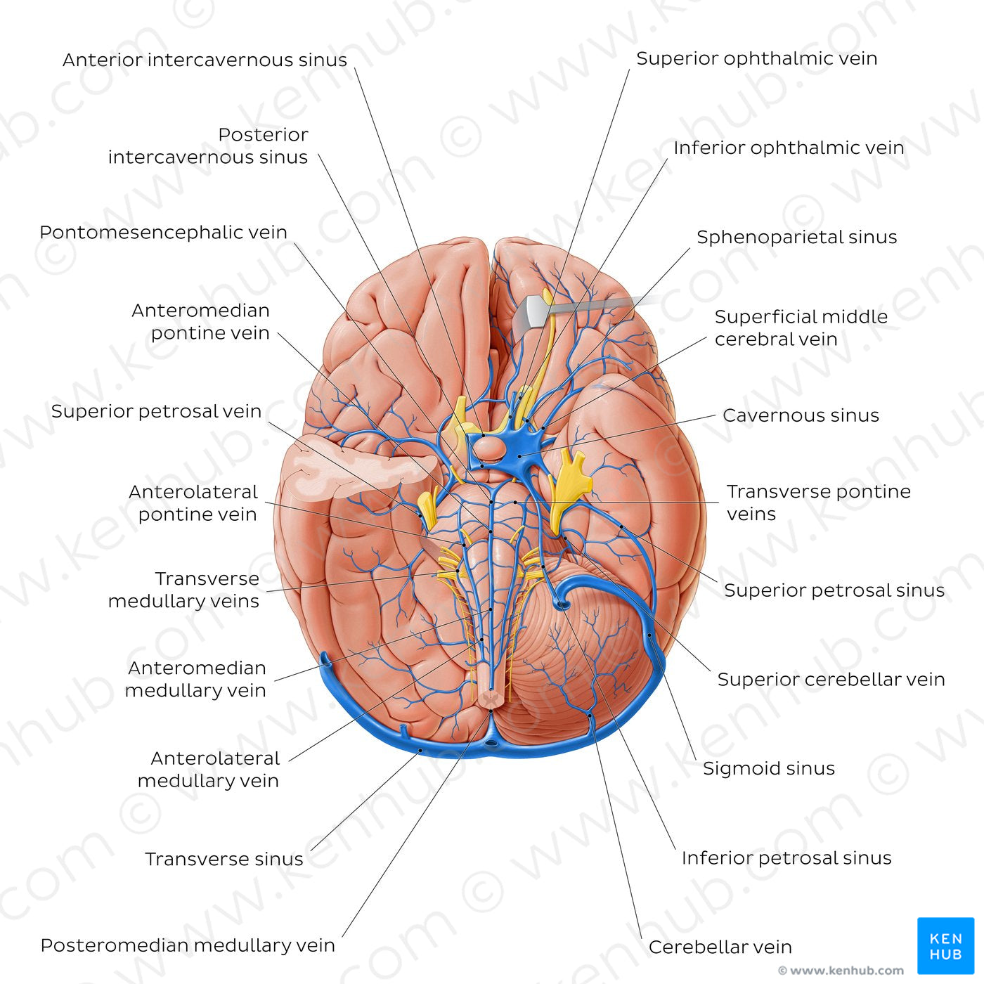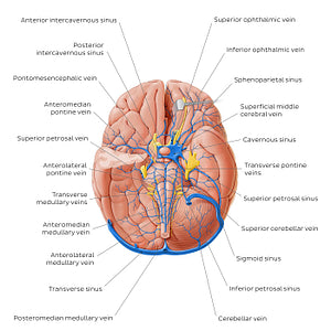 Venous drainage of the cerebellum is achieved through the superior and inferior cerebellar veins, the cerebellar vein (precentral cerebellar vein) and the petrosal vein. The superior cerebellar veins mainly drain the superior region of the cerebellum and empty into the straight sinus, the great cerebral vein (of Galen) (see previous image), the transverse sinus and/or the inferior petrosal sinus. It is formed by the inferior cerebellar veins, also known as the internal cerebellar veins. Their tributaries drain blood from the inferior cerebellum into the right and left sigmoid sinuses, the inferior petrosal sinus, the occipital and straight sinuses (see previous image). The venous drainage of the brainstem involves a superficial plexus of veins which drain blood from the midbrain, pons and medulla oblongata to the vertebral veins, the veins of the spinal cord, and the basilar and inferior petrosal sinuses, as well as into the basal and great cerebral veins (see previous images).