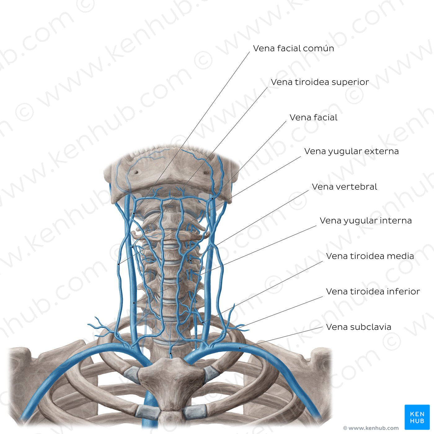 Las principales venas del cuello son las venas yugulares externa, interna y anterior. La vena yugular externa generalmente está formada por las venas auricular posterior y la división posterior de la vena retromandibular (no mostrada en la imagen) y drenan en la vena subclavia en la raíz del cuello. Las afluentes de la vena yugular externa incluyen a la vena yugular anterior, vena cervical transversa, vena supraescapular y la vena yugular externa posterior (no mostrada en la imagen). La vena yugular interna desciende a través del cuello, uniéndose a la vena subclavia para formar las venas braquiocefálicas izquierda/derecha. A diferencia de su contraparte arterial (la arteria carótida interna), la vena yugular interna recibe numerosos afluentes dentro del cuello, la más destacada es la vena facial común la cual desemboca alrededor del nivel del hueso hioides o inferior a este. Las venas tiroideas superior y media drenan regiones de la glándula tiroides y la laringe, vaciando su contenido en la vena yugular interna, mientras la vena tiroidea inferior drena directamente en la vena braquiocefálica izquierda. La vena vertebral desciende dentro de los forámenes transversos de las vértebras cervicales y también desemboca en la vena braquiocefálica.
