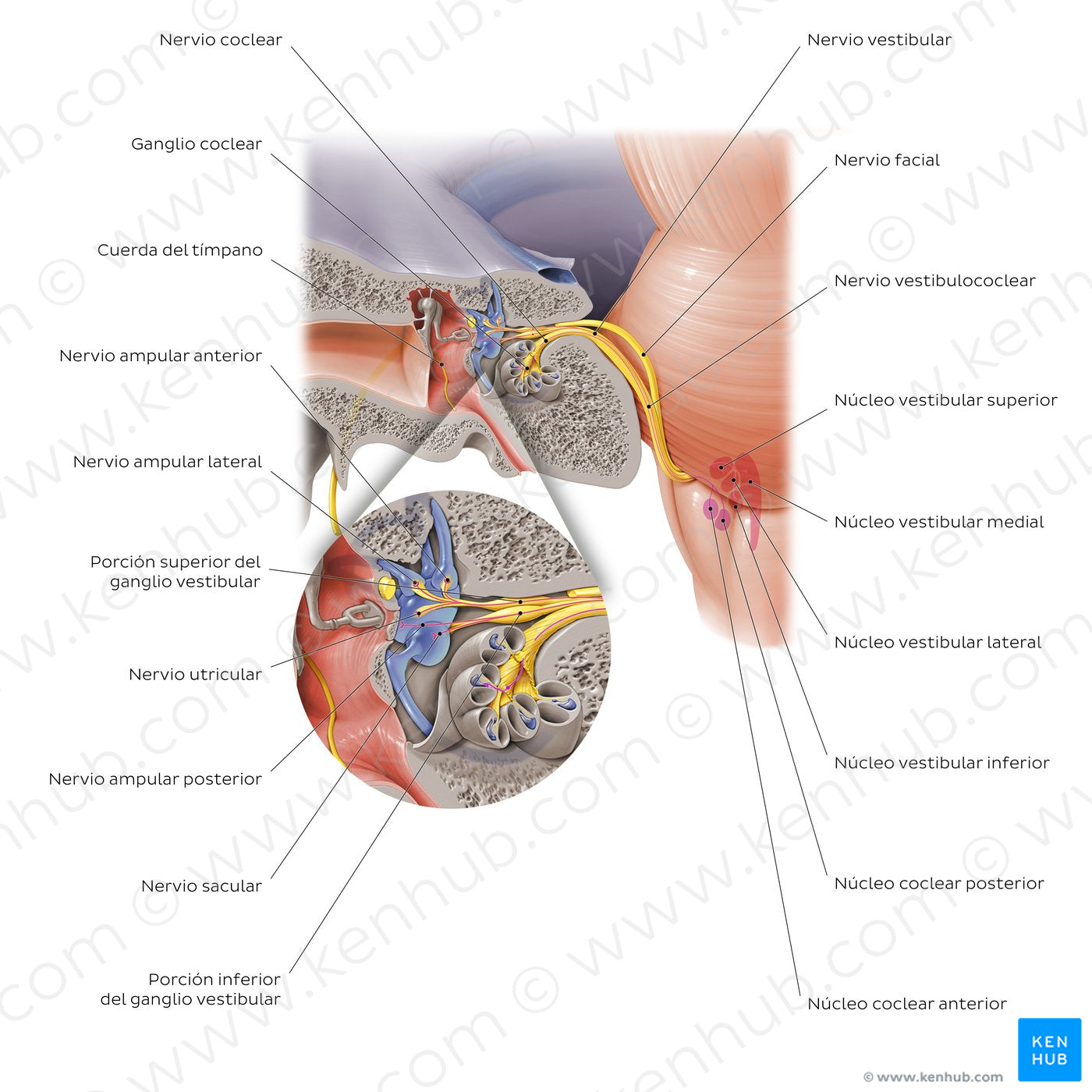 El nervio vestibulococlear (VIII par craneal) surge del tronco encefálico en la unión pontobulbar/ángulo pontocerebeloso. Sale del cráneo a través del conducto auditivo interno, donde se divide en los nervios vestibular y coclear. El nervio vestibular contiene los axones de las neuronas cuyos cuerpos celulares se encuentran en el ganglio vestibular, encontrado en el extremo lateral/fondo del conducto auditivo interno. El ganglio vestibular emerge y procede a inervar al aparato vestibular (utrículo, sáculo, conductos semicirculares). Los nervios ampular anterior, ampular lateral y utricular surgen del ramo superior, mientras que los nervios ampular posterior y sacular son ramos del componente inferior. Estos nervios recolectan la información relacionada al movimiento y a la posición de la cabeza y lo transmiten a los núcleos vestibulares (superior, inferior, medial y lateral) en la porción inferior del puente/superior del bulbo raquídeo para mantener el balance y equilibrio. El nervio coclear contiene los axones de las neuronas cuyos cuerpos celulares están ubicado en el ganglio coclear/espiral, que se ubica en el conducto espiral del modiolo de la cóclea. Los procesos periféricos de estas neuronas envían terminaciones a los receptores en el órgano espiral (de Corti), que recoge información auditiva y la transmite por medio del nervio coclear hacia los núcleos cocleares (anterior y posterior) en el tronco encefálico, y por último a la corteza auditiva primaria del lóbulo temporal.