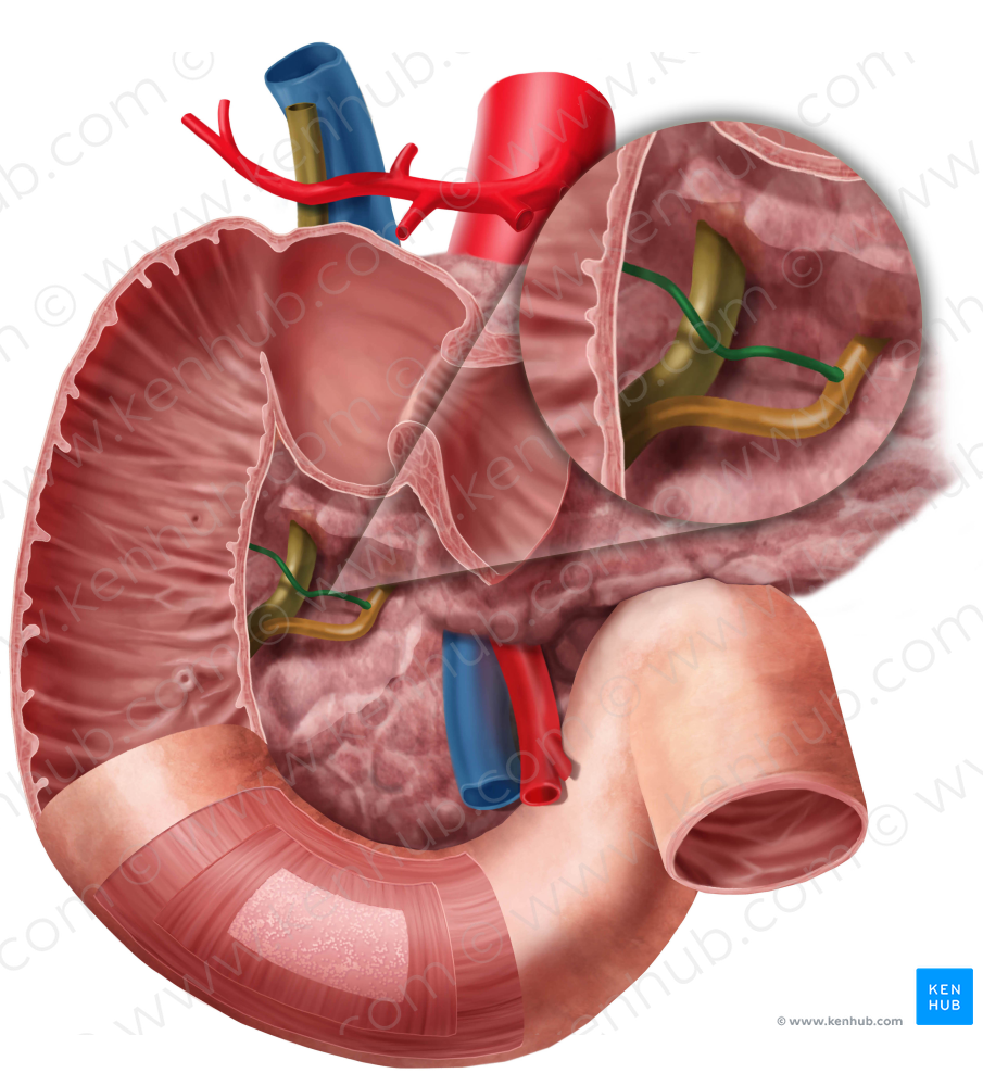 Shown from anterior perspective. Also known as Duct of Santorini, and Minor pancreatic duct.