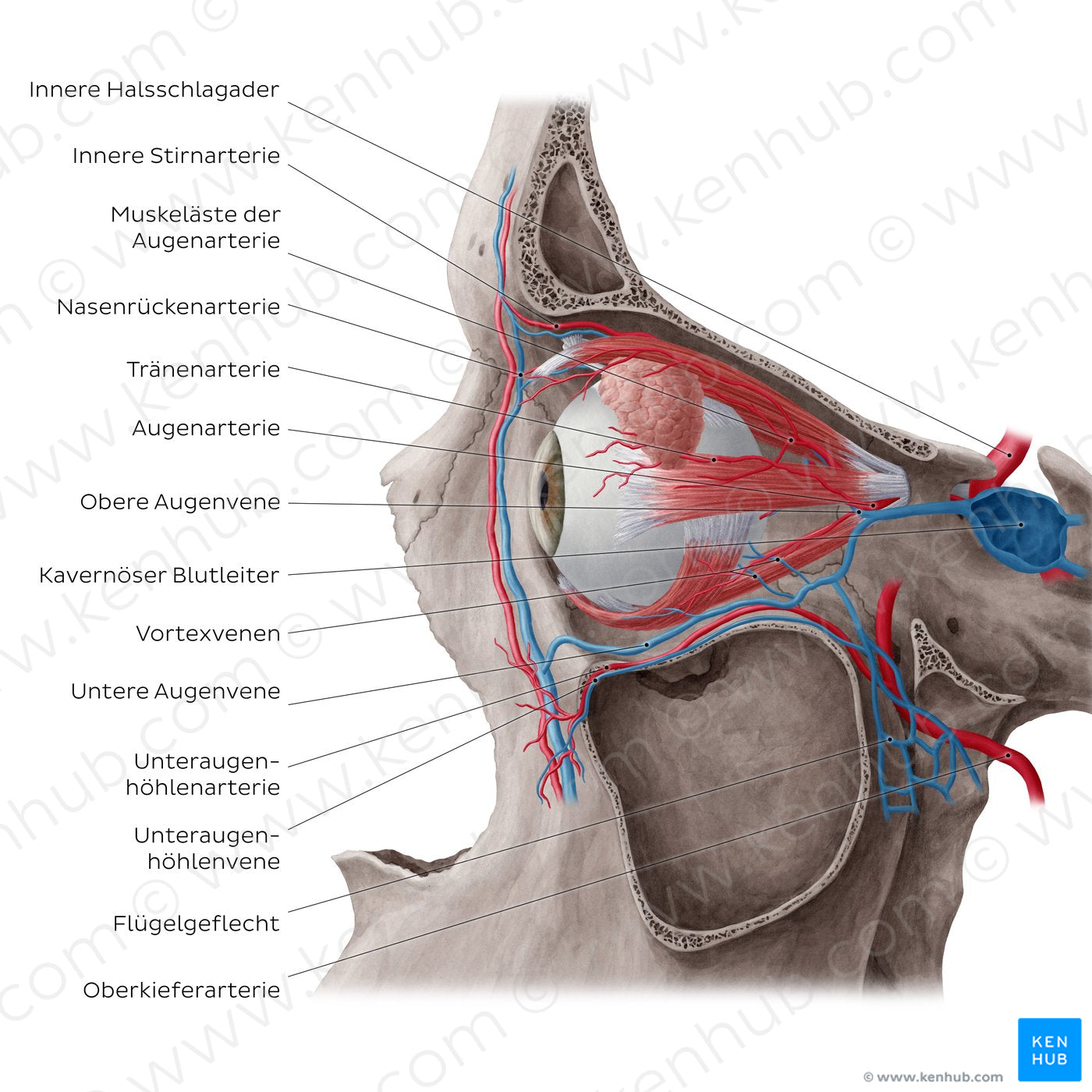 Die Hauptarterie in dieser Region ist die Augenarterie, die aus der inneren Halsschlagader entspringt und 10 Äste abgibt, die alle Strukturen der Augenhöhle sowie einige umliegende Strukturen versorgen. Die Tränenarterie entspringt aus der Augenarterie lateral vom Sehnerv und zieht nach anterior, um die Tränendrüse zu versorgen. Die Muskeläste der Augenarterie versorgen die inneren Augenmuskeln und geben einen kleinen Ast ab, die vordere Ziliararterie, die den vorderen Augapfel versorgt. Die innere Stirnarterie und Nasenrückenarterie ziehen durch die Augenhöhle und verlassen diese, um die Nase, Augenlider, Stirn und Kopfhaut zu versorgen. Andere Äste der Augenarterie (zentrale Netzhautarterie, hintere Ziliararterien, inneren Lidarterien, Oberaugenhöhlenarterie und vordere und hintere Siebbeinarterie) können aus superiorer Ansicht betrachtet werden. Neben der Augenarterie wird die Orbitaregion noch von der Oberkieferarterie versorgt. Sie zieht von der äußeren Halsschlagader und gibt den Unteraugenhöhlenast ab, der für die Versorgung des Orbitabodens zuständig ist. Der venöse Abfluss der Augenhöhle geschieht hauptsächlich durch die oberen und unteren Augenvenen, die zentrale Netzhautvene, Vortexvenen und die Unteraugenhöhlenvene, welche in den Sinus cavernosus der Schädelhöhle und das Flügelgeflecht der Unterschläfengrube drainieren.