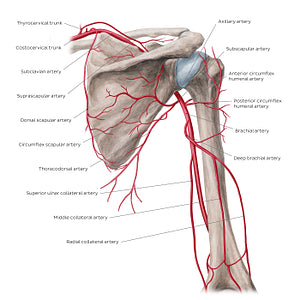 Oxygenated blood is supplied to the proximal upper limb (pectoral girdle region) by arterial branches originating from the subclavian artery. The thyrocervical trunk, a short and wide vessel arising from the first segment of the subclavian artery, vascularizes the deep cervical and shoulder muscles as well as the skin of the neck and shoulders. A branch of the thyrocervical trunk, the suprascapular artery, courses inferolaterally towards the superior border of the scapula to supply muscles in the shoulder and scapular region, including skin of the upper thoracic cage and shoulder. The dorsal scapular artery, an independent branch of the subclavian artery, supplies two superficial muscles of the back, the levator scapulae and rhomboid muscles. It anastomoses with the suprascapular artery in the posterior scapular region. Together with the subscapular artery and its branch, the circumflex scapular artery, they form the scapular anastomosis. The thoracodorsal artery, a branch of the subscapular artery, descends with the thoracodorsal nerve to supply muscles of the back and skin in the axillary region. The largest branch of the brachial artery is the deep brachial artery which supplies the posterior arm muscles. It divides into two branches, the middle collateral and the radial collateral arteries which contribute to the arterial anastomosis of the elbow. Specifically, the radial collateral artery supplies the radial nerve, the brachioradialis and brachialis muscles.