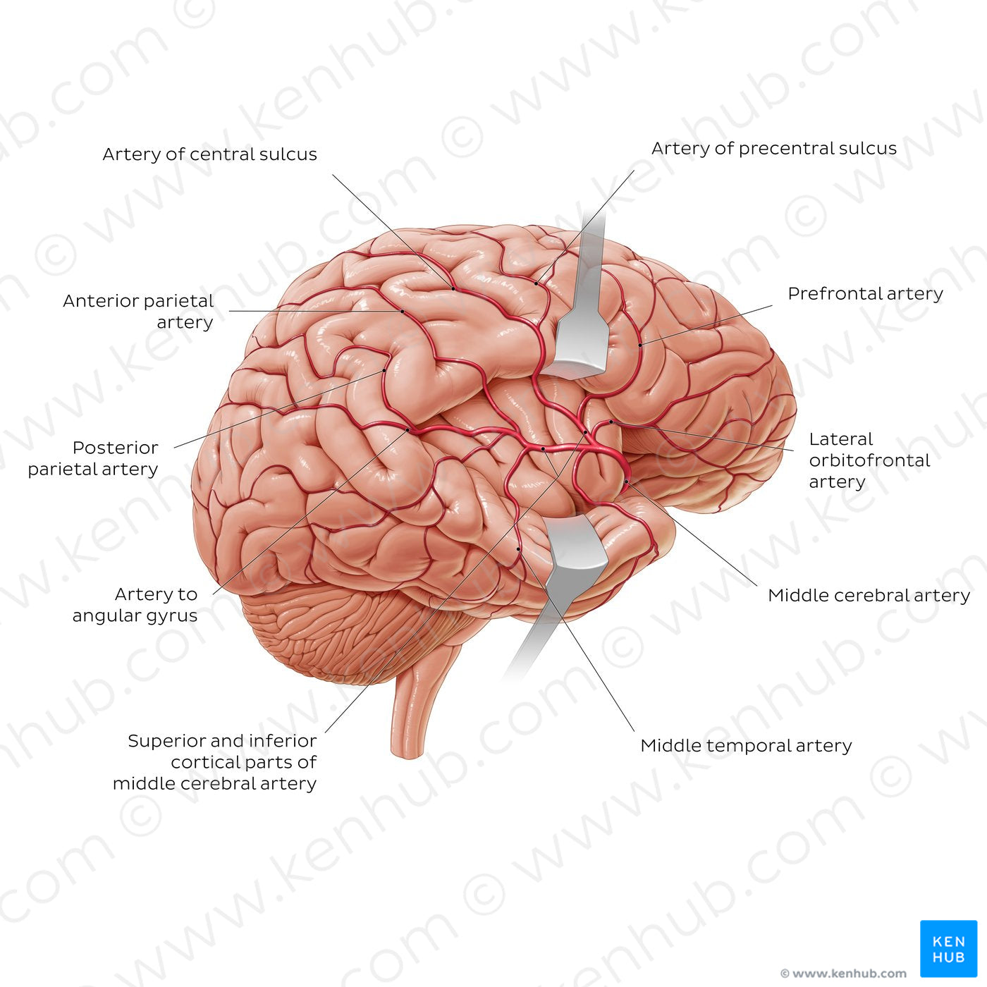 Lateral view of the brain with its arterial vessels; the lateral sulcus has been opened to expose the arteries within. The prominent vessel seen from this view is the middle cerebral artery (MCA), which is the direct continuation of the internal carotid artery. It provides a large number of small central branches (e.g. anterolateral central arteries) as well as several larger cortical branches such as the lateral orbitofrontal artery, insular arteries (not shown) as well as several additional temporal, frontal and parietal cortical branches. The cortical branches of the MCA supply most of the lateral surface of the frontal, parietal and temporal lobes (except for the superior border of the former two and inferior border of the latter). Smaller central branches supply the basal ganglia and internal capsule.