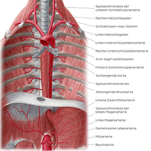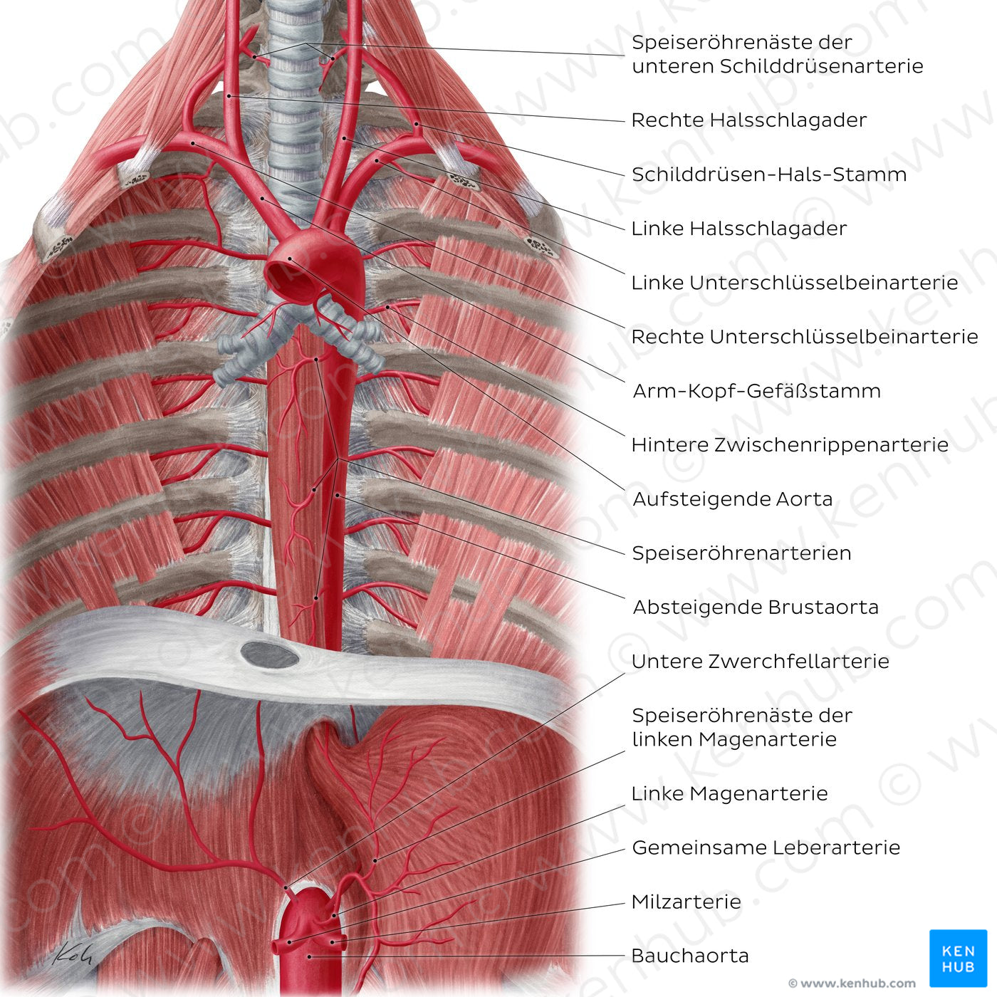 Die arterielle Versorgung ist oben in der Abbildung sichtbar. Die untere Schilddrüsenarterie, die direkten Speiseröhren- und Bronchialäste aus der absteigenden Brustaorta sowie die linke Magen- und Zwerchfellarterie sorgen für die arterielle Blutversorgung. Der venöse Abfluss ist unten in der Abbildung dargestellt. Die Speiseröhre wird von den Speiseröhrenvenen über einen Venenplexus drainiert. Die Speiseröhrenvenen münden dann in das Azygosvenensystem sowie in die Zwischenrippenvenen, die Bronchialvenen, die untere Zwerchfellvene und die linke Magenvene.