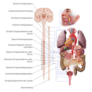 Der Ursprung des sympathischen Nervensystems befindet sich im thorakalen und lumbalen Abschnitt des Rückenmarks, weshalb es auch als thorakolumbaler Teil bezeichnet wird. Die Sympathikusbahn lässt sich vereinfacht in folgende Komponenten unterteilen: präganglionäre Neuronen, sympathische Ganglien und postganglionäre Neuronen. Die präganglionären (präsynaptischen) Neuronen befinden sich in den thorakalen und lumbalen Segmenten (Th1-L2) des Rückenmarks. Sie projizieren Axone (präganglionäre Fasern), die mit den postganglionären (präsynaptischen) Neuronen in den sympathischen Ganglien, die sich normalerweise in der Nähe der Wirbelsäule befinden, synaptieren. Die postganglionären Neuronen geben lange Axone (postganglionäre Fasern) ab, die die Ganglien verlassen und auf viszerale Effektoren projizieren, wo sie den Neurotransmitter Noradrenalin freisetzen.