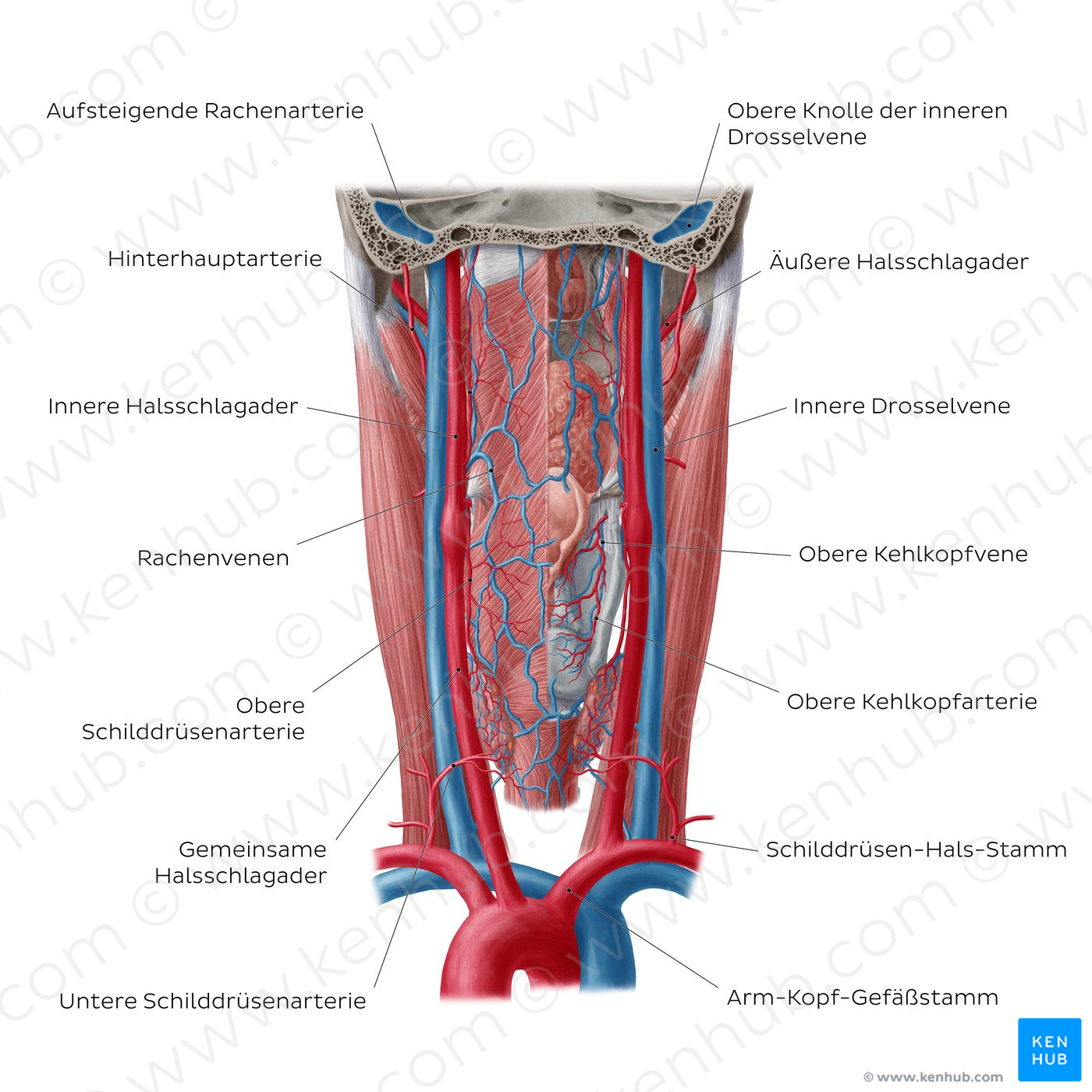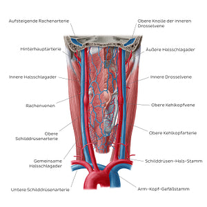 Aus posteriorer Perspektive sind die wichtigen Blutgefäße des Kopfes und Nackens auf beiden Seiten des Pharynx dargestellt. Jede Halsschlagader teilt sich im Hals jeweils in eine innere und eine äußere Halsschlagader. Die innere Halsschlagader steigt lateral im Hals zum Pharynx auf und tritt dann in den Schädel ein, um das Gehirn zu versorgen. Die äußere Halsschlagader gibt mehrere Äste ab, von denen einige für die Blutversorgung der oberen Regionen des Pharynx verantwortlich sind. Aus dieser Perspektive sieht man einen dieser Äste - die aufsteigende Rachenarterie. Sie ist ein langes, schmales Blutgefäß, das tief im Hals liegt. Es entspringt der äußeren Halsschlagader nahe der Karotisgabel und steigt entlang des Pharynx auf, wobei es Äste abgibt, die verschiedene Strukturen im oberen Teil des Pharynx versorgen. Die unteren Bereiche des Pharynx werden über pharyngeale Äste der unteren Schilddrüsenarterie versorgt, welche aus dem Schilddrüsen-Hals-Stamm der Unterschlüsselbeinarterie entspringt. Die Rachenvenen bilden einen Venenplexus, der weiter abwärts in die innere Drosselvene mündet.