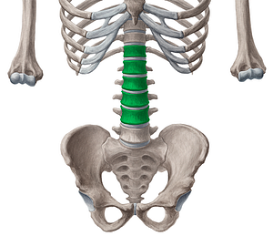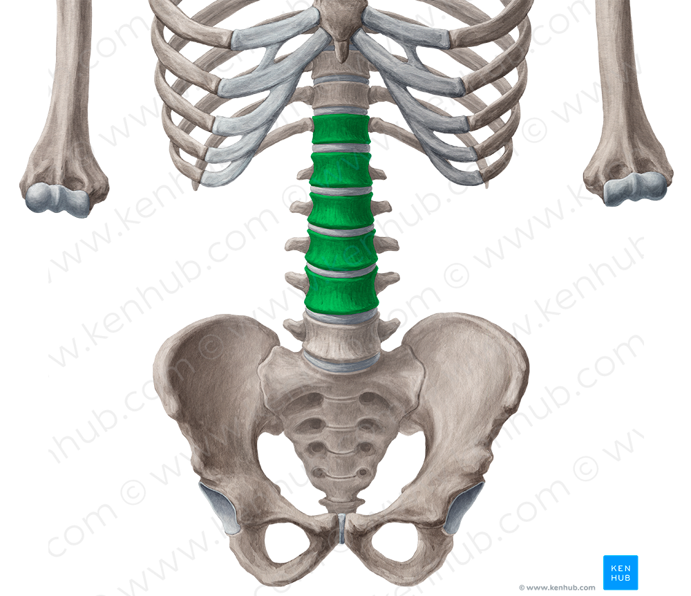 Shown from anterior perspective. Also known as Body of vertebra T12-L4, Vertebral bodies T12-L4, and Vertebral body T12-L4.