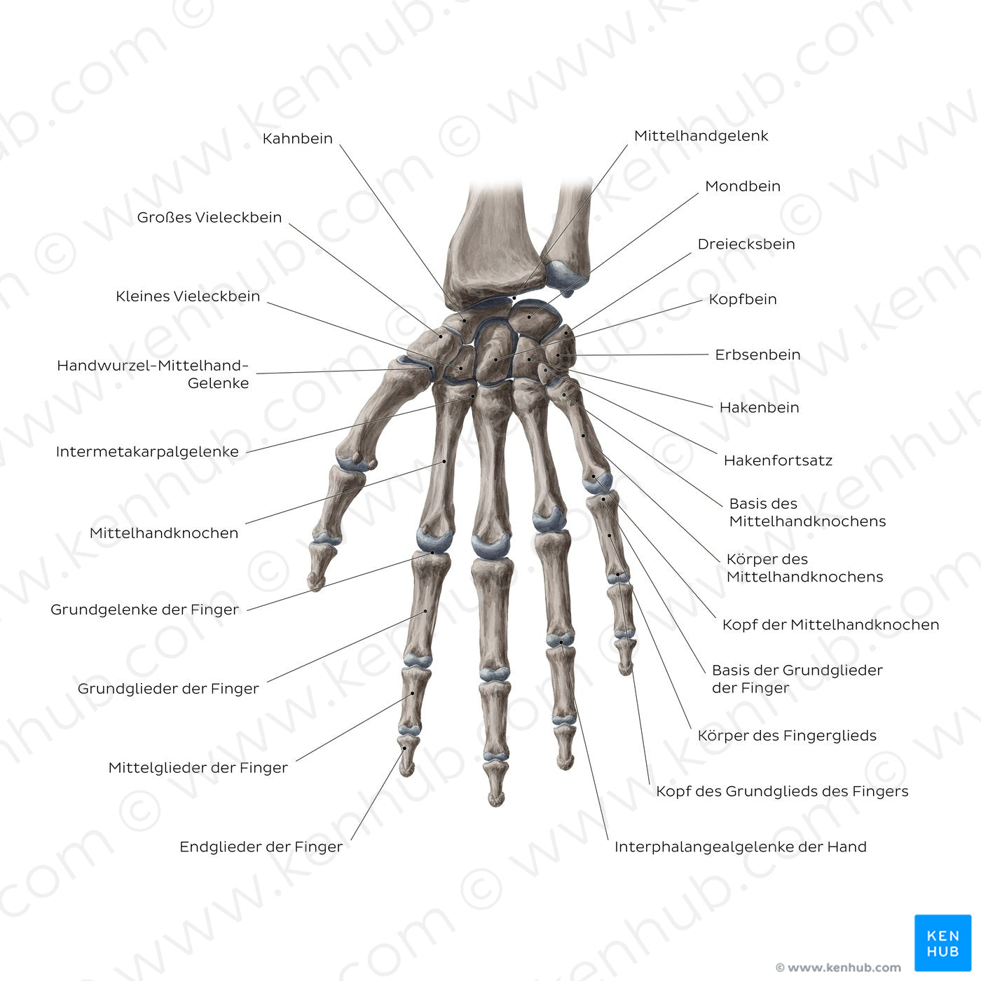 Auf der Abbildung sind die Knochen der Hand und der Handwurzel von palmar (ventral) dargestellt. Die Knochen werden in drei Gruppen unterteilt: Handwurzelknochen, Mittelhandknochen und Fingerknochen. Bemerkenswert ist, dass die Gelenke, die die Knochen verbinden, nach den in den Gelenken beteiligten Knochen benannt (z. B. Handwurzel-Mittelhand-Gelenke) sind.