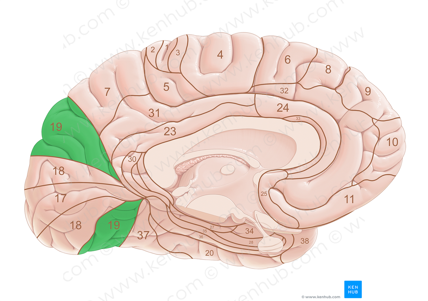 Shown from sagittal perspective. Also known as BA19.