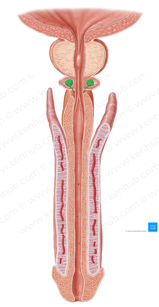 Shown from coronal perspective. Also known as Gland of Mery, and Cowper's gland.