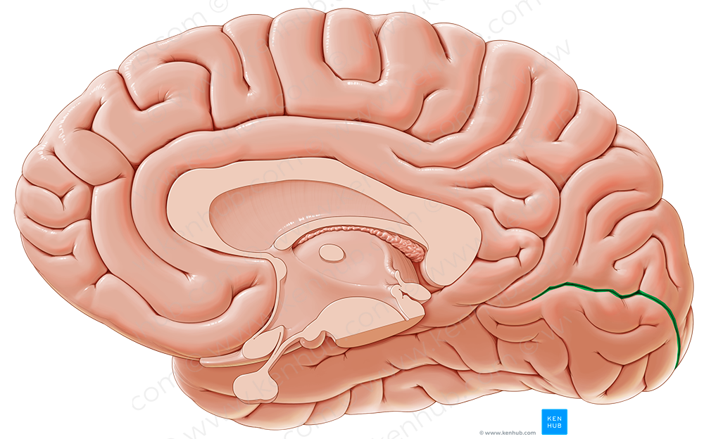 Shown from sagittal perspective. Also known as Calcarine fissure.