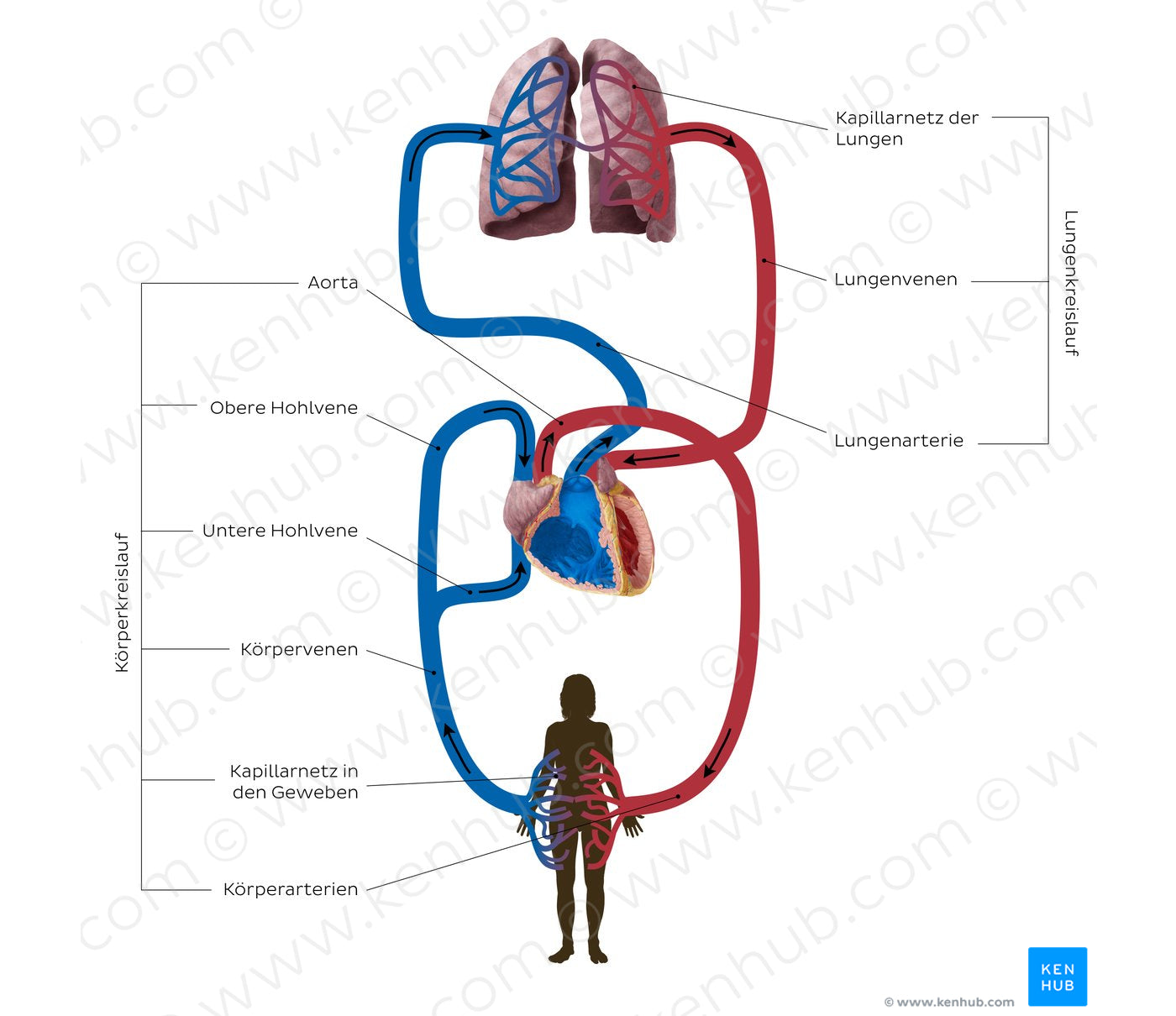 Das kardiovaskuläre System besteht aus zwei Anteilen: dem Lungenkreislauf (kleiner Kreislauf) und dem systemischen Kreislauf (großer Kreislauf). Der Lungenkreislauf beginnt im rechten Ventrikel des Herzens. Er transportiert sauerstoffarmes Blut zum Gasaustausch in die Lunge. Das sauerstoffreiche Blut gelangt anschließend aus der Lunge in den linken Vorhof des Herzens. Die Verteilung des Blutes im Körper erfolgt über den systemischen Kreislauf. Das sauerstoffreiche Blut wird aus dem linken Ventrikel des Herzens durch die Aorta und die systemischen Arterien zu den Kapillarbetten peripherer Gewebe und Organe transportiert. Sauerstoffarmes Blut wird dann von den systemischen Venen des Kreislaufs in die obere und untere Hohlvene drainiert. Aus ihr gelangt das Blut zurück in den rechten Vorhof des Herzens.