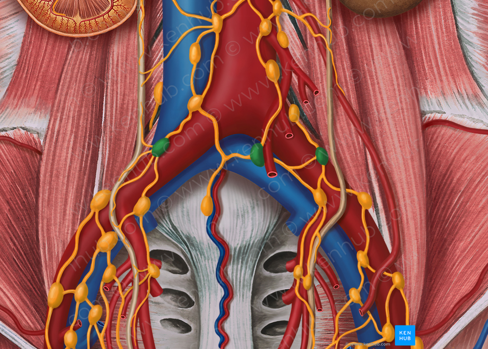 Shown from anterior perspective. Also known as Posterior iliac lymph nodes, and Superior iliac lymph nodes.