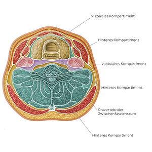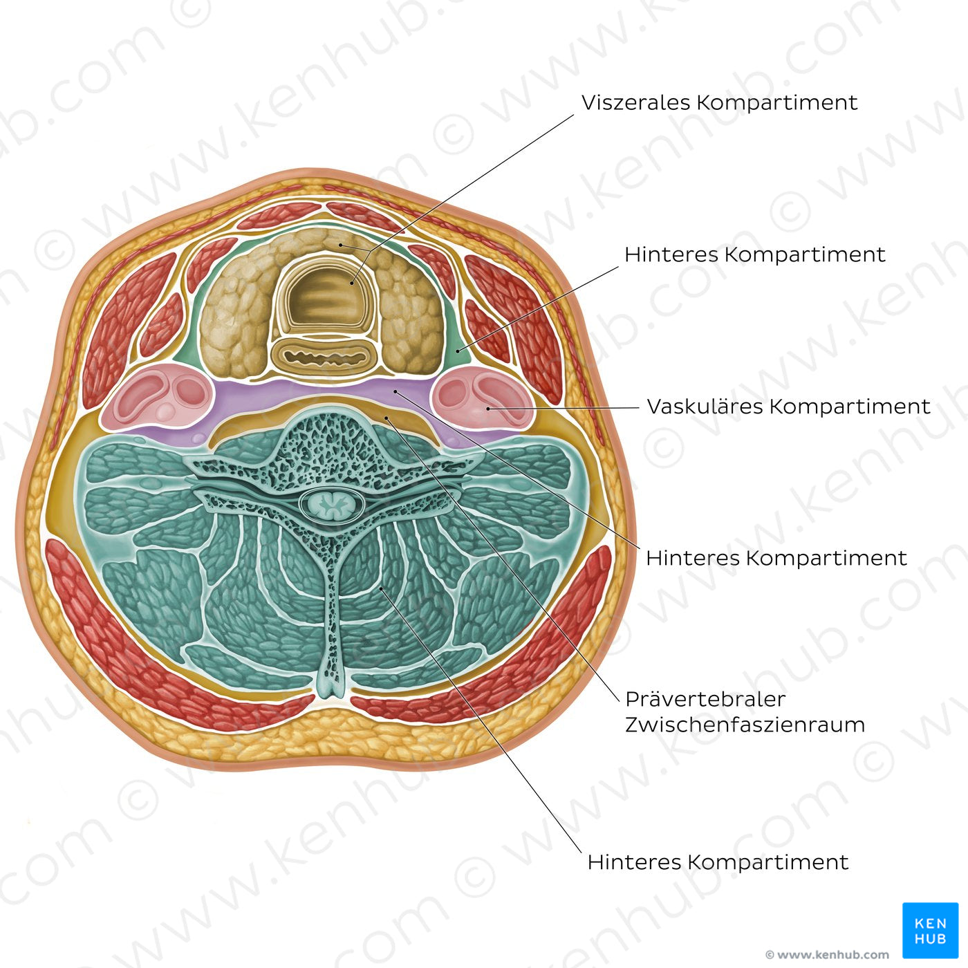 Das viszerale Kompartiment des Halses ist von der viszeralen Halsfaszie umgeben, und zwar anterolateral von dem mittleren Blatt der Halsfaszie und posterior von der Wangen-Rachen-Faszie. Sie erstreckt sich vom oberen Teil des Zungenbeins (superior) bis zum oberen Mediastinum (inferior). Es ist das am weitesten anterior gelegene Kompartiment des Halses. Hinter dem viszeralen Kompartiment befindet sich das große vertebrale Kompartiment des Halses. Dieses Kompartiment ist posterolateral von der prävertebralen Faszie und anterior von der Alar-Faszie umgeben. Es zieht sich superior als durchgehender Kreis von der Schädelbasis aus und erstreckt sich inferior bis zum oberen Mediastinum.Die paarigen Gefäßkompartimente (auch Karotisräume genannt), die von den Karotisscheiden gebildet werden, beherbergen die großen Gefäßkanäle des Halses (gemeinsame Halsschlagader, innere Drosselvene). Jedes Gefäßkompartiment erstreckt sich von der Schädelbasis bis zum Aortenbogen in der Brusthöhle.Zwischen der obersten Schicht der zervikalen Faszie und dem mittleren Blatt der Halsfaszie befindet sich der am weitesten anterior gelegene Faszienraum, der prätracheale Raum. Er erstreckt sich vom Schilddrüsenknorpel nach oben und erreicht nach unten das obere Mediastinum. Die Wangen-Rachen-Faszie bildet zusammen mit der Karotisscheide und der Alar-Faszie der tiefen Schicht der tiefen Halsfaszie einen fettgefüllten Raum, der als Retropharyngealraum bezeichnet wird. Der prävertebrale Zwischenfaszienraum, der zwischen der Alar und prävertebralen Faszie liegt, befindet sich unmittelbar vor den Halswirbelkörpern und erstreckt sich von der Schädelbasis bis zum hinteren Mediastinum, wo die prävertebralen Schichten der tiefen Halsfaszie verschmelzen. Der prävertebrale Zwischenfaszienraum wird so genannt, weil sein lockeres Areolargewebe einen Durchgangsweg für die rasche Ausbreitung der Infektion von Hals in die Thoraxregion bietet. Der retropharyngeale Raum und der Gefahrenraum erstrecken sich von der Schädelbasis nach oben bis zum hinteren Mediastinum nach unten.