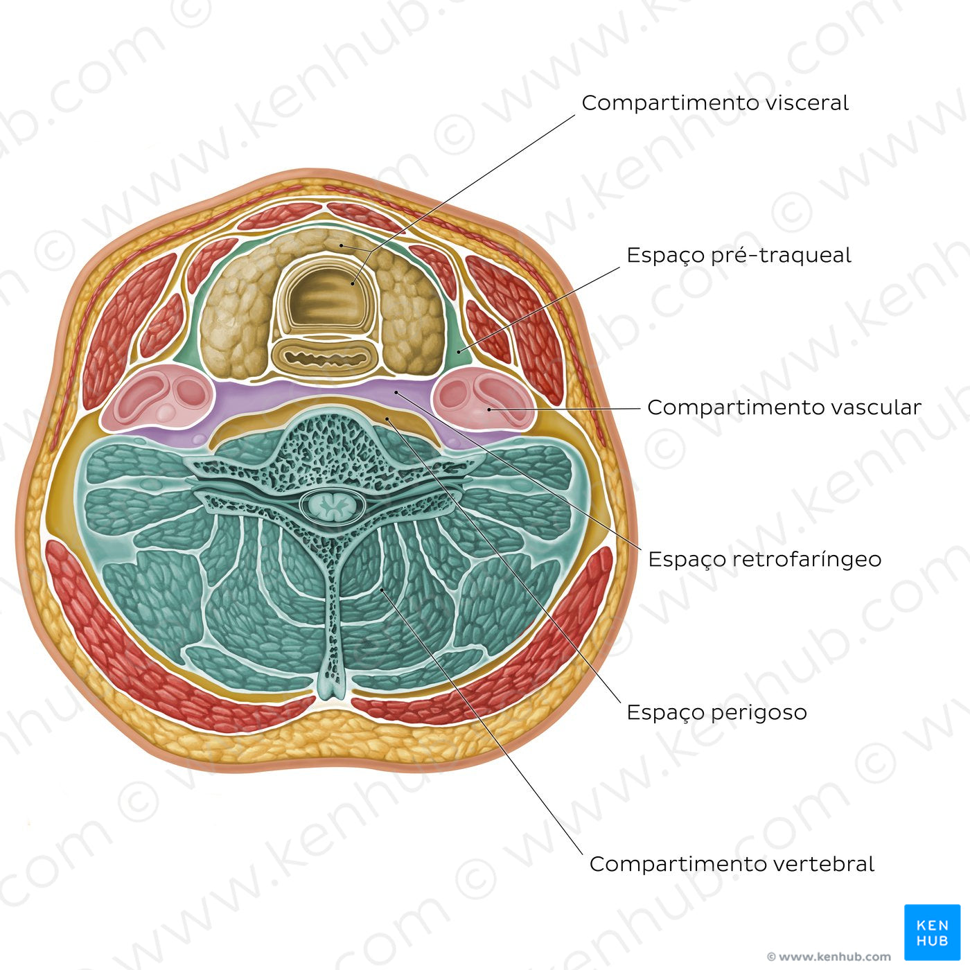 O compartimento visceral do pescoço é revestido pela fáscia cervical visceral, especificamente pela fáscia pré-traqueal anterolateralmente e pela fáscia bucofaríngea posteriormente. Ele se estende da parte superior do osso hioide, superiormente, até o mediastino superior, inferiormente. Esse é o compartimento mais anterior do pescoço.Posteriormente ao compartimento visceral encontramos o grande compartimento vertebral do pescoço. Esse compartimento é revestido posterolateralmente pela fáscia pré-vertebral e anteriormente pela fáscia alar. Ele se fixa superiormente na base do crânio por meio de um círculo contínuo e se estende até o mediastino superior inferiormente.O par de compartimentos vasculares (ou seja, espaços carotídeos), formados pelas bainhas carotídeas, possuem grandes canais vasculares do pescoço (artéria carótida comum e veia jugular interna). Cada compartimento vascular se estende da base do crânio até o arco aórtico, dentro da cavidade torácica.Entre a camada superficial da fáscia cervical profunda e a fáscia pré-traqueal encontramos o espaço fascial mais anterior, o espaço pré-traqueal. Ele se estende da cartilagem tireóidea superiormente até o mediastino superior inferiormente.A fáscia bucofaríngea, juntamente com a bainha carotídea e a fáscia alar do folheto profundo da fáscia cervical profunda, formam um espaço preenchido por gordura conhecido como espaço retrofaríngeo. O espaço perigoso, que fica entre as fáscias alar e pré-vertebral, se localiza logo anteriormente aos corpos vertebrais e se expande da base do crânio até o mediastino posterior, onde as camadas pré-vertebrais da fáscia cervical profunda se fundem. O espaço perigoso possui esse nome devido ao fato de que o seu tecido conjuntivo frouxo fornece um caminho que permite que uma infecção do pescoço alcance a região torácica. Os espaços retrofaríngeo e perigoso se estendem da base do crânio superiormente até o mediastino posterior inferiormente.