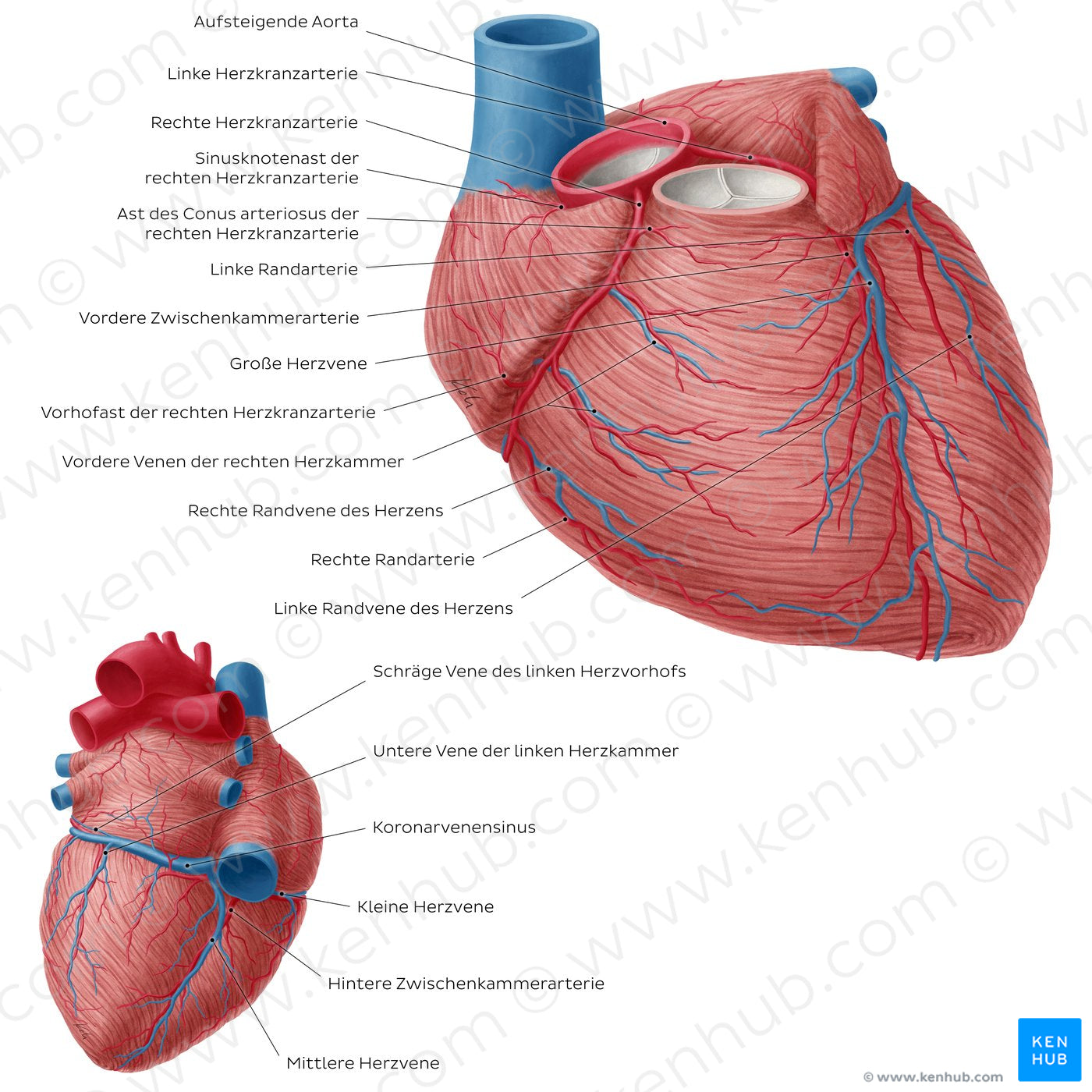 Der Kreislauf des Herzens beginnt mit zwei Hauptarterien, die aus der Aorta an den Taschen der Aortenklappe entspringen. Die rechte Herzkranzarterie wickelt sich um das rechte Herz und verläuft in der Herzkranzfurche. Aus dieser Arterie entspringen drei Gruppen von Ästen (vordere Äste, Randäste und untere Äste (früher auch als hintere Äste bezeichnet), die den Großteil der Strukturen des rechten Herzens versorgen. Die linke Herzkranzarterie verläuft zur vorderen Zwischenkammerfurche, wo sie sich in ihre zwei Endäste verzweigt; die vordere Zwischenkammerarterie und den Ramus circumflexus der linken Herzkranzarterie. Die größte Vene des Herzens ist der Koronarvenensinus. Er verläuft in der Herzkranzfurche an der Unterseite des Herzens und drainiert den Großteil des venösen Abflusses des Herzens in den rechten Vorhof. Der Koronarvenensinus hat zahlreiche Zuflüsse, inklusive der großen, mittleren und kleinen Herzvene, der unteren Vene der linken Herzkammer und der schrägen Vene des linken Herzvorhofs. Die größte Vene an der Vorderseite des Herzens ist die große Herzvene. Diese Vene erhält Blut aus vielen Venolen der Herzkammer und des linken Herzvorhofs, der linken Randvene des Herzens und der vorderen Zwischenkammervene.