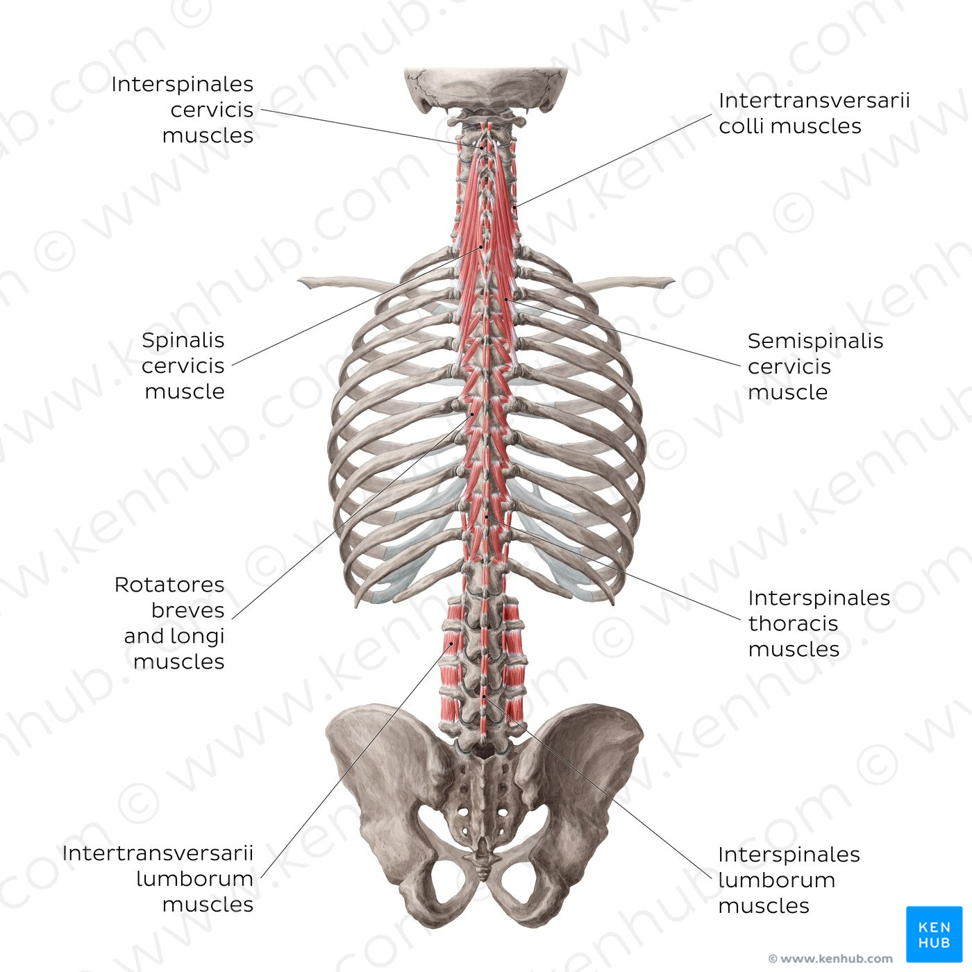 The deep and deepest layers of the deep back muscles consist of several smaller muscle groups. Broken down simply, the deep layer consists of a muscle group called transversospinal muscles, subdivided into the semispinalis, multifidus and rotatores muscles. These subgroups are further broken down into regional components, with the exception of the rotatores that are divided based on their length into the short and long rotatores breves and longi.The deepest layer consists of three muscle groups: levatores costarum, interspinales and intertransversarii muscles. They are often referred to as the segmental or minor back muscles given their small size and limited role in the back movements.