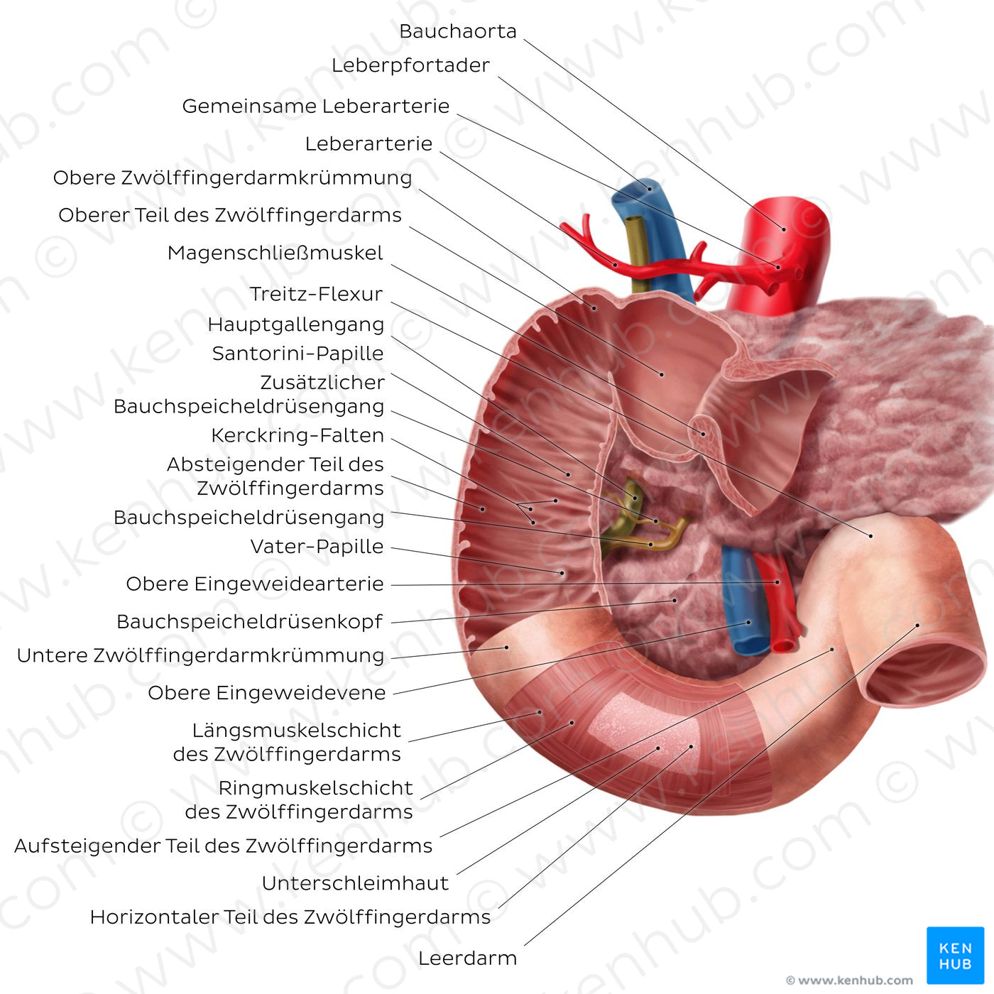 Die vordere Wand des Pars superior und descendens wurden entfernt, um die luminale Struktur des Duodenums sichtbar zu machen. Diese wirft ab dem absteigenden Anteil zirkuläre Falten (Kerckring-Falten) auf. Man erkennt hier auch zwei kleine Öffnungen in der Pars descendens. Durch die Vater-Papille (Papilla duodeni major) gelangen Pankreasenzyme und Galle aus der Vereinigung des Ductus pancreaticus und des Ductus choledochus in das Duodenum. Der Zusammenschluss dieser beiden Gänge wird als Ampulla hepatopancreatica bezeichnet. Die Papilla duodeni minor ist eine Öffnung für Pankreasenzyme aus dem Ductus pancreaticus accessorius. Die verschiedenen Wandschichten des Duodenums sind am horizontalen Abschnitt sichtbar.
