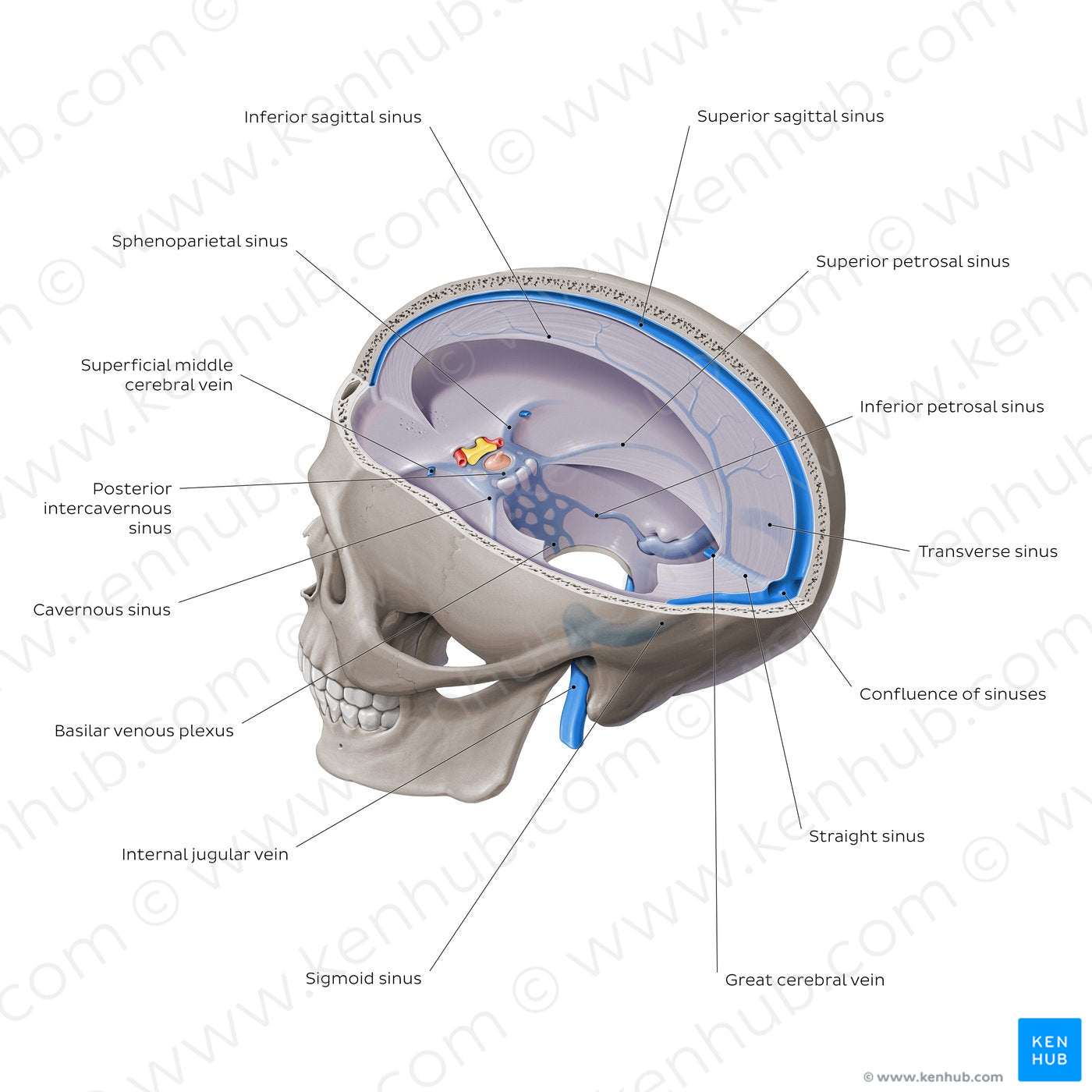 The superior sagittal sinus is located superiorly in the midline and oriented in the sagittal plane. It extends from the foramen caecum of the frontal bone to the confluence of sinuses where it merges with three major sinuses including the straight, occipital and transverse sinuses. The inferior sagittal sinus runs parallel to the superior sagittal sinus, along the free border of the falx cerebri. It terminates by merging with the great cerebral vein (of Galen) to form the straight sinus. The right and left transverse sinuses are bilateral structures located in the tentorium cerebelli which drain into the sigmoid sinuses. The sigmoid sinuses then pass through the jugular foramen to drain into the internal jugular vein.
