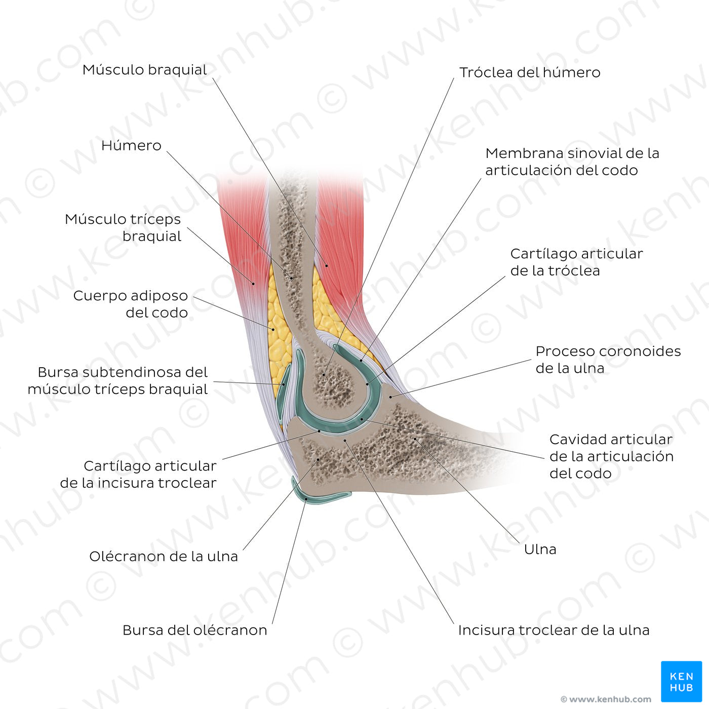 La articulación del codo está envuelta en una cápsula articular compuesta por una capa fibrosa externa y revestida internamente por una membrana sinovial. Durante los movimientos (flexión y extensión), los cuerpos adiposo son halados hacia afuera por las adherencias tendinosas del músculo braquial y tríceps braquial para permitir que exista espacio para ser utilizado por los procesos óseos. La extensión del codo se ve facilitada por la bursa del olécranon, la cual sirve como un componente de lubricación entre el olécranon de la ulna y la piel suprayacente.
