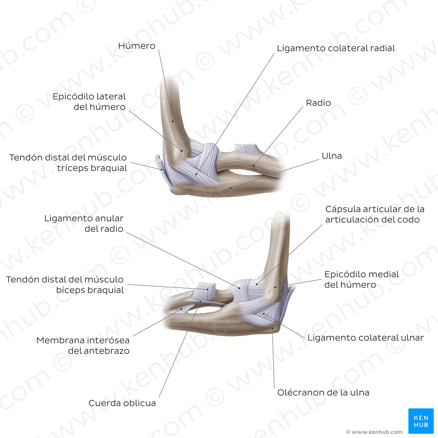 La articulación del codo está compuesta por tres articulaciones en realidad; la humeroulnar, humeroradial y radioulnar proximal. La articulación humeroulnar es aquella que se ubica entre la tróclea en el aspecto medial de la extremidad distal del húmero y la escotadura troclear en la ulna proximal. La articulación humeroradial se forma entre el capítulo en el aspecto lateral de la extremidad distal del húmero con la cabeza del radio. En la articulación del codo, la extremidad proximal del radio y la ulna se articulan entre sí en la articulación radioulnar proximal. Existen tres ligamentos principales que soportan la articulación del codo: el ligamento colateral ulnar, el ligamento colateral radial y el ligamento anular del radio. Los ligamentos colateral ulnar y radial están compuestos cada uno por tres partes: - El ligamento colateral ulnar: haz anterior, haz posterior y haz transverso (ligamento de Cooper). - El ligamento colateral radial: ligamento anular, ligamento colateral radial (propio) y el ligamento colateral ulnar lateral.