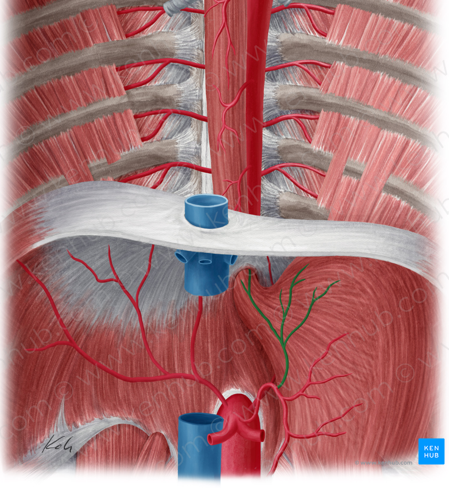 Shown from anterior perspective. Also known as Oesophageal branches of left gastric artery, and Paracardiac branches of left gastric artery.