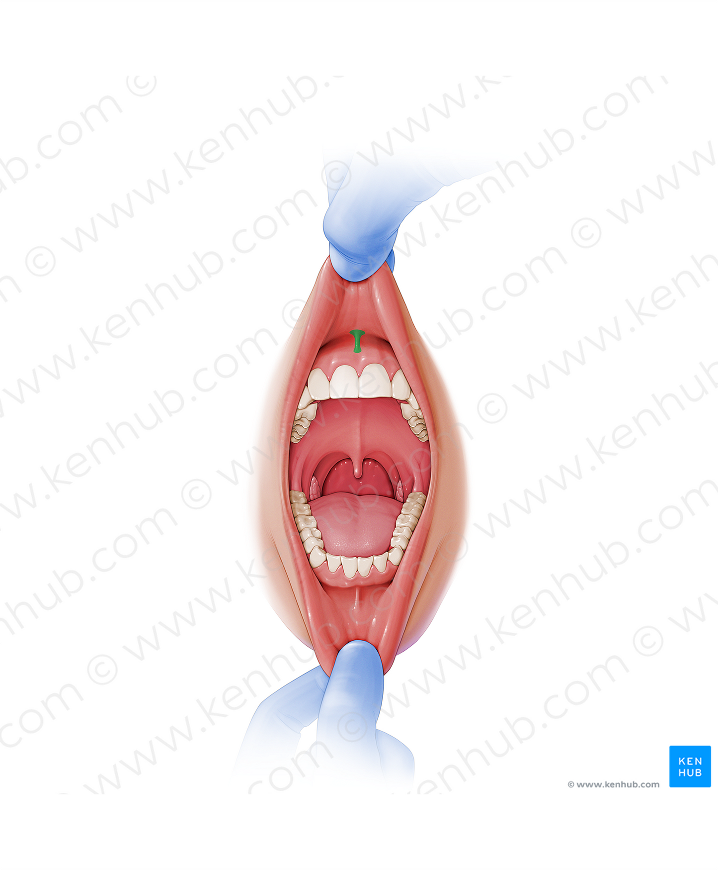 Shown from anterior perspective. Also known as Superior labial frenulum, and Maxillary labial frenulum.