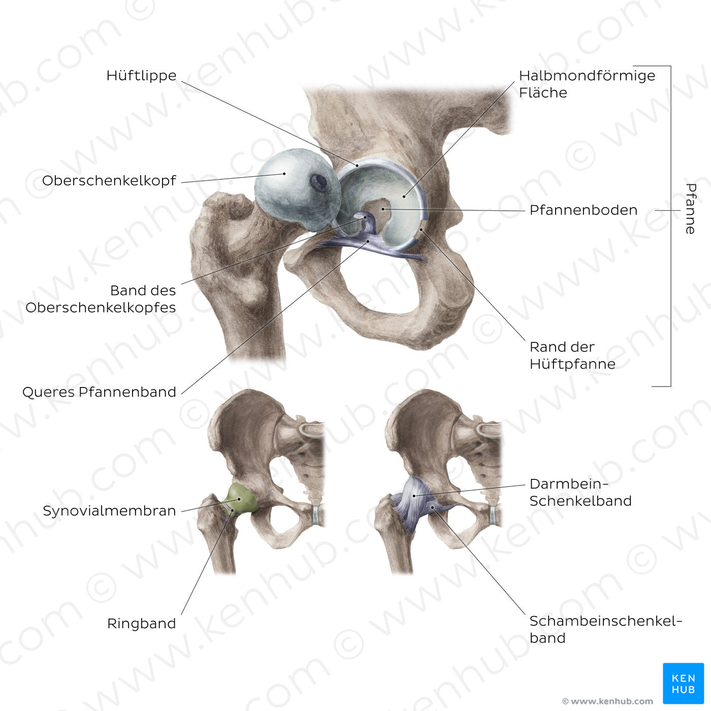 Das Hüftgelenk besitzt mehrere Bänder, die eine wichtige Rolle spielen, um es bei Bewegungen zu stabilisieren. Sie werden in 2 Gruppen eingeteilt. Die kapsulären Bänder verstärken die Gelenkkapsel. Zu ihnen zählen das Darmbeinschenkelband (Lig. iliofemorale), Schambeinschenkelband (Lig. pubofemorale) und Sitzbeinschenkelband (Lig. ischiofemorale). Die intrakapsulären Bänder liegen innerhalb der Gelenkkapsel. Zu ihnen zählen das quere Pfannenband (Lig. transversum acetabuli) und das Hüftkopfband (Lig. capitis femoris).