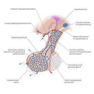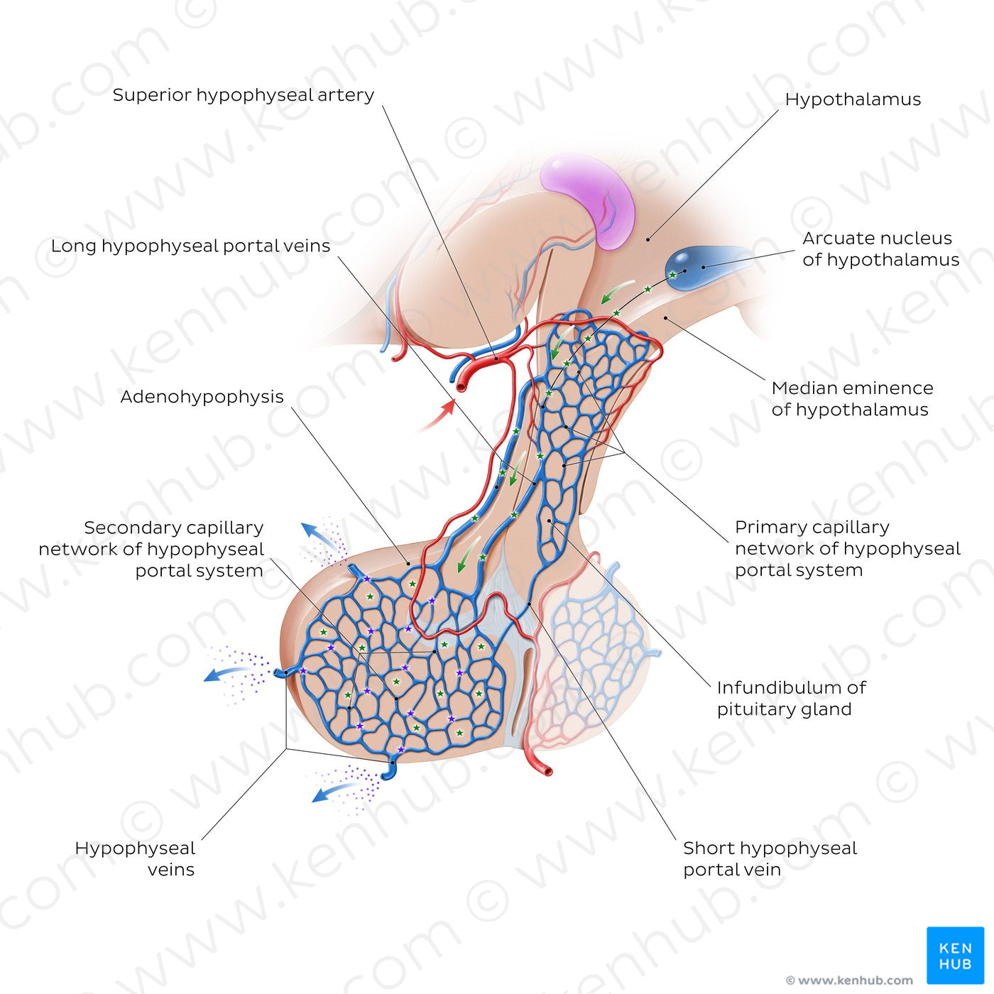The hypophyseal portal system is a network of blood vessels that allows the hypothalamus to exert control over the adenohypophysis via a system that allows the exchange and transport of hormones between the hypothalamus and adenohypophysis. The two primary arteries of the hypophyseal portal system are superior and inferior hypophyseal arteries, branches of the internal carotid artery. Branches of the superior hypophyseal artery form a primary capillary network located within the infundibulum and median eminence of the hypothalamus. The capillaries of this network receive hypothalamic hormones produced by the arcuate nucleus and other periventricular zone nuclei of the hypothalamus and merge together to form the long and short hypophyseal portal veins that travel to the adenohypophysis. These veins then divide again and form a secondary capillary network where the hormones carried from the hypothalamus stimulate or inhibit the release of anterior pituitary hormones. This forms a direct vascular pathway between the site where hypothalamic hormones are released (median eminence) and the endocrine cells of the adenohypophysis.