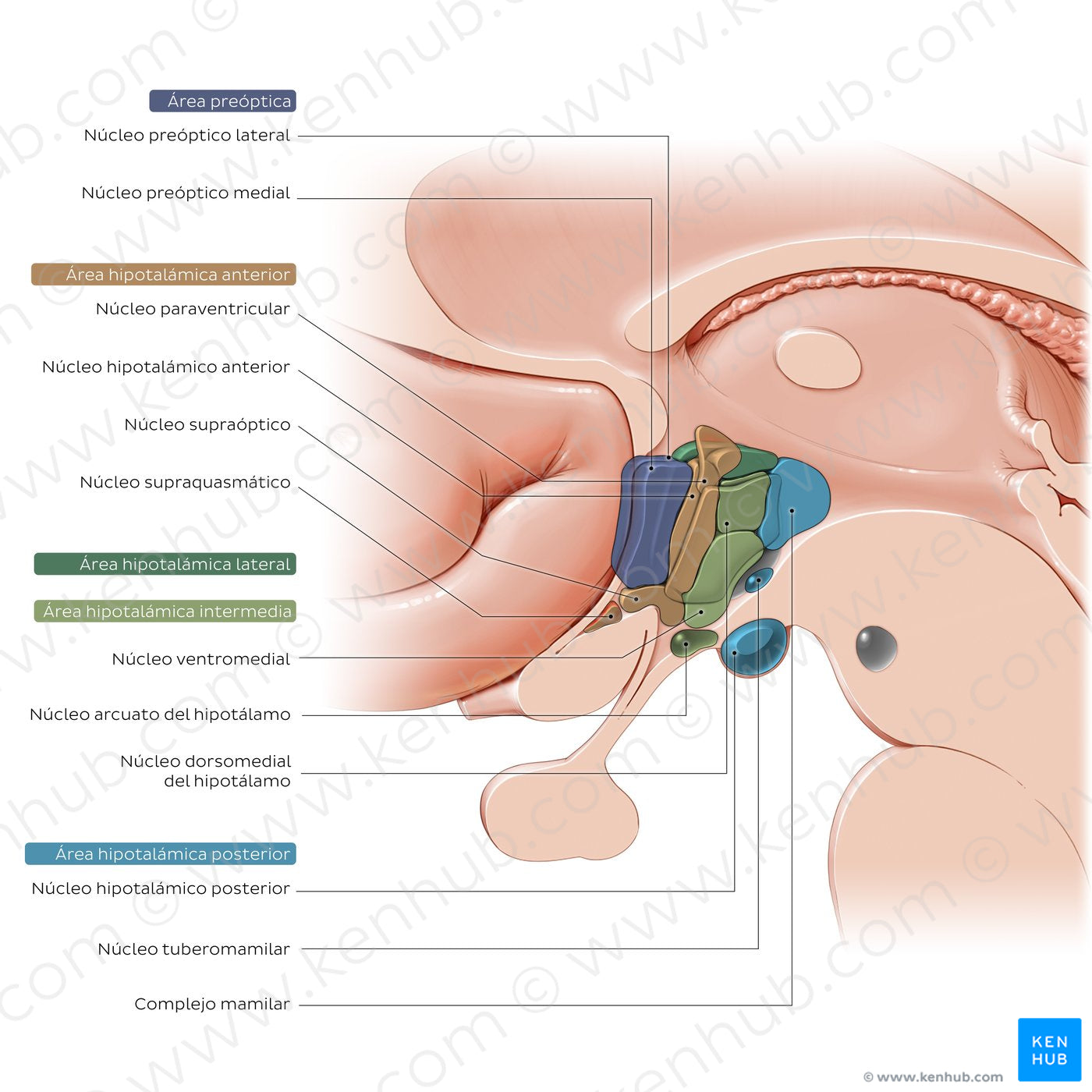Aquí tenemos una vista mediosagital del diencéfalo con los núcleos y tractos del hipotálamo. Los cuerpos de las neuronas del hipotálamo están organizados en estructuras de sustancia gris especializadas llamadas núcleos hipotalámicos. Estos núcleos establecen varias conexiones (tractos) con diferentes regiones del sistema nervioso central. El hipotálamo recibe principalmente información (fibras aferentes) del sistema límbico, así como de núcleos sensitivos y motores del tronco del encéfalo y la médula espinal. Sus fibras eferentes se dirigen principalmente hacia el tálamo, hipocampo, amígdala, tronco del encéfalo y médula espinal. A través de sus conexiones, este controla las funciones de los sistemas límbico, endocrino y nervioso autónomo.