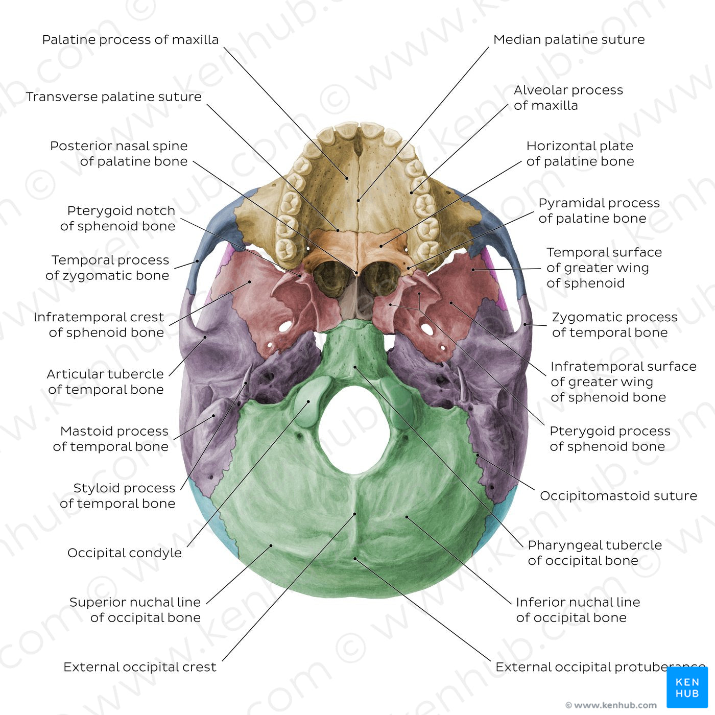 The external surface of the occipital bone is defined by several well defined ridges and crests, namely the external occipital crest as well as the superior and inferior occipital lines. Also visible are the occipital condyles, which articulate with the atlas (vertebra C1). The temporal bone presents more prominent landmarks compared to its posterior neighbor, the largest of which being the mastoid, styloid and zygomatic processes. Important landmarks of the sphenoid bone from this perspective include pterygoid process (located centrally); this is formed of medial and lateral plates, the former of which bears a hooked shaped extremity known as the pterygoid hamulus. The horizontal plates of the palatine bones along with the palatine processes of the maxillae form the hard palate.