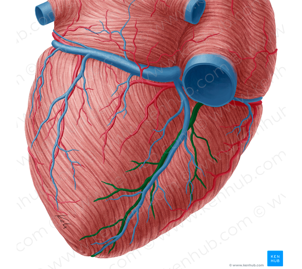 Shown from posterior perspective. Also known as Posterior interventricular artery, Posterior interventricular branch of right coronary artery, Inferior interventricular branch of right coronary artery, Posterior descending artery, PDA, Posterior descending branch of right coronary artery, and Interventricular branch of right coronary artery.