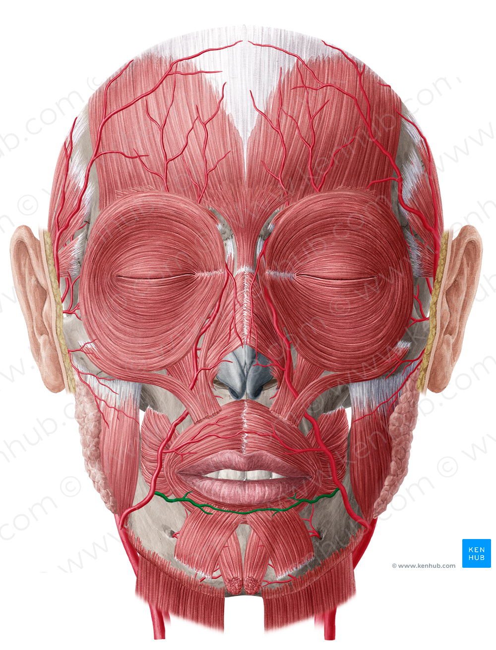 Shown from anterior perspective. Also known as Inferior labial branch of facial artery, and Mandibular labial artery.