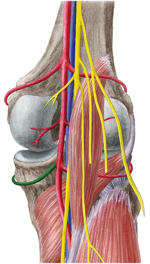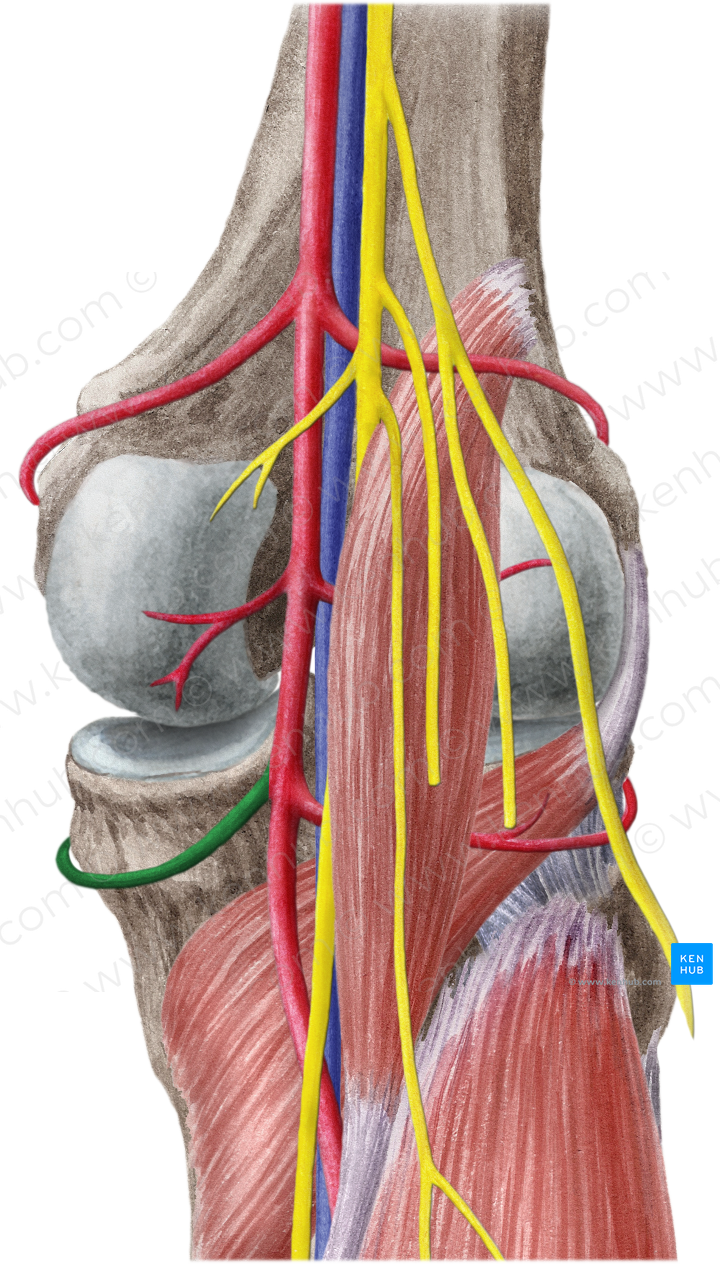 Shown from posterior perspective. Also known as Distal tibial genicular artery.