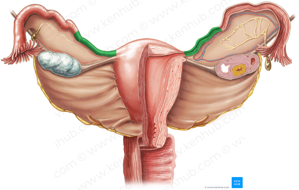 Shown from anterior perspective. Also known as Isthmus of oviduct, and Isthmus of Fallopian tube.