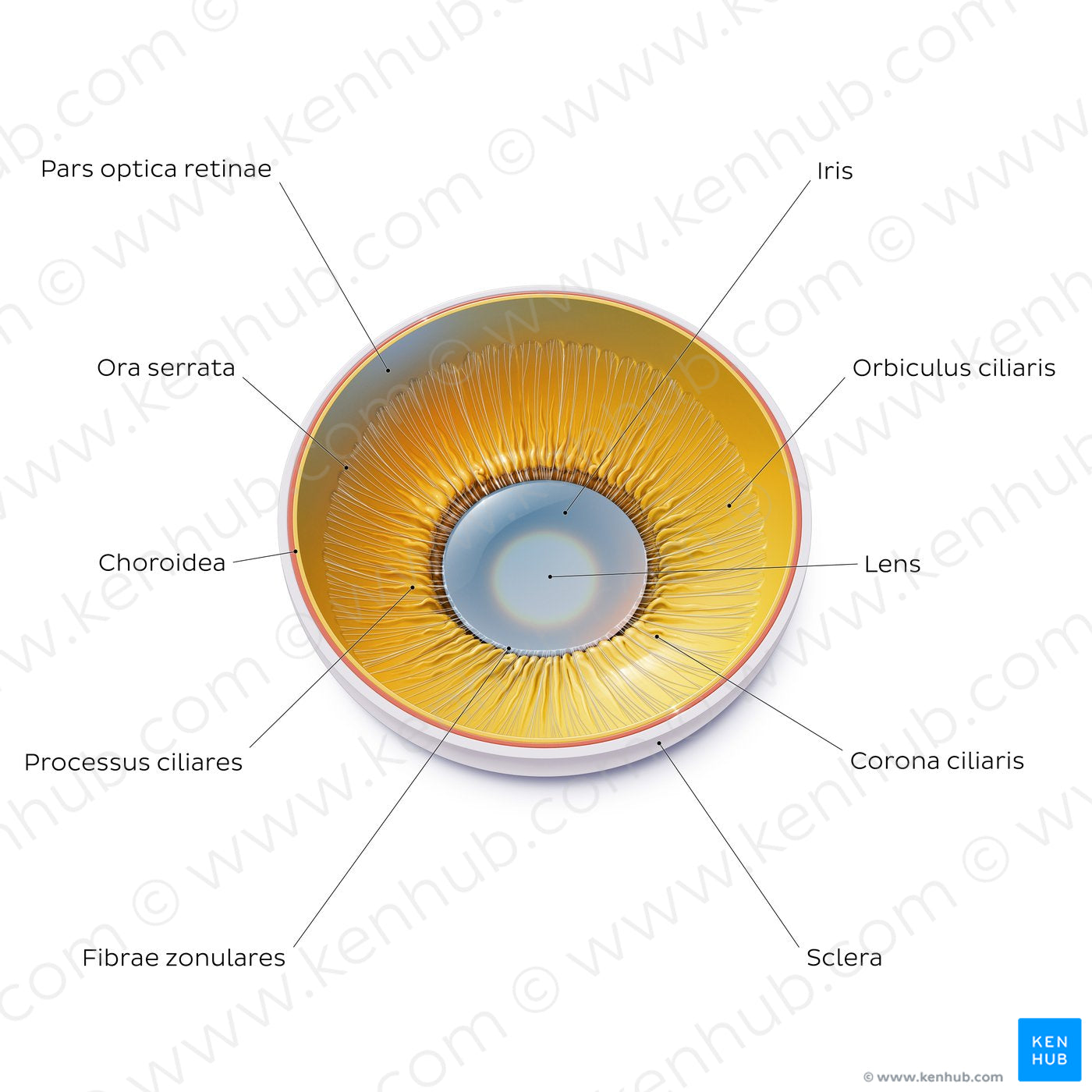 At the centre of this image is the lens, located just posterior to the iris and anterior to the camera postrema/vitrea bulbi oculi. The capsula lentis is anchored to adjacent processus ciliares of the corpus ciliare by fibrae zonulares which collectively form the apparatus suspensorius lentis/zonula ciliaris. The anterior portion of the corpus ciliare is known as the corona ciliaris/pars plicata and is marked by processus ciliares which function to produce humor aquosus within the camera posterior providing nutrients for the cornea and lens. The orbiculus ciliaris/pars plana forms the posterior portion of the corpus ciliare and terminates along the ora serrata. The pars optica retinae is continuous with the choroidea and sclera before terminating anteriorly at the ora serrata while the pars caeca retinae extends over the corpus ciliare and iris.
