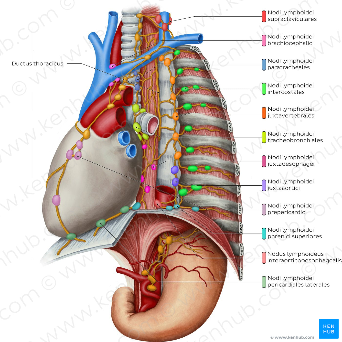 Several groups of nll. mediastinales (nll. viscerales thoracis) are visible. The nll. brachiocephalici/nll. mediastinales anteriores are located in the mediastinum superius anterior to the great vessels. The nll. tracheobronchiales/nll. mediastinales intermedii surround the bifurcatio tracheae, as well as the superior and inferior aspects of the bronchi principales. The nll. juxtaesophageales, nl. interaorticooesophagealis and nll. juxtaaortici lymph nodes are commonly grouped as nll. mediastinales posteriores. They drain adjacent organs, vessels and tissues of the mediastinum posterius and send efferents to the nll. paratracheales and ductus lymphaticus dexter/thoracicus.Nll. lymphoidei parietales thoracis visible in this illustration include the nll. intercostales, nll. juxtavertebrales and nll. diaphragmatici superiores. They collect the lymph from the mm. profundi dorsi and mm. intercostales, the pleura parietalis and columna vertebralis. Lymph drained from the upper nll. intercostales (approx. levels 1-7) drains into a common truncus intercostalis destined for the nll. supraclaviculares while the lower nll. intercostales often drain below the diaphragma to the nll. Gastrici, nll. coeliaci/ or cisterna chyli before ultimately reaching the ductus thoracicis. Efferent vessels of the nll. juxtavertebrales may follow a similar drainage pattern and/or alternatively pass via the nll. mediastinales posteriores. The nll. diaphragmatici superiores drain the diaphragm, pars diaphragmatica pericardii/pleurae. They usually drain to the nll. parasternales (not shown) or nll. mediastinales posteriores.