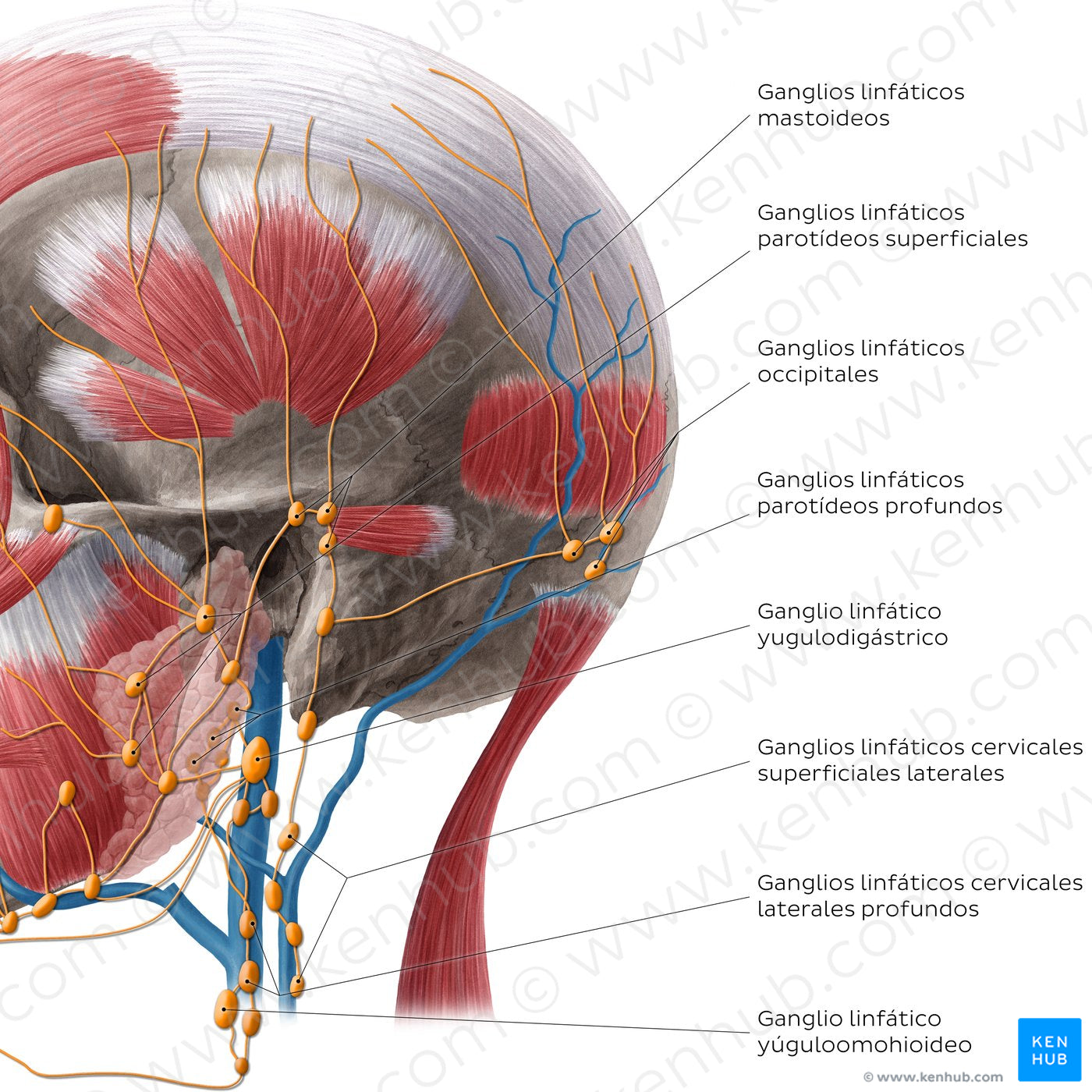 En la unión entre la cabeza y el cuello existen cinco grupos de ganglios linfáticos que conforman el anillo superficial de ganglios linfáticos. Estos son específicamente los ganglios linfáticos occipitales, mastoideos, parotídeos superficiales y profundos, submandibulares y submentonianos. Estos ganglios linfáticos reciben la linfa de las regiones de la nariz, las mejillas, la oreja, la piel cabelluda y la barbilla, drenando en los ganglios linfáticos ya sea superficiales o en los profundos. Los ganglios linfáticos del cuello se dividen en ganglios linfáticos anteriores superficiales y profundos y ganglios linfáticos laterales superficiales y profundos. Desde esta vista lateral, se pueden observar las porciones proximales de los ganglios cervicales laterales superficiales y profundos. Los ganglios linfáticos cervicales laterales superficiales se ubican adyacentes a la vena yugular externa, reciben drenaje linfático desde el anillo linfático pericervical y desembocan en los ganglios linfáticos supraclaviculares en la raíz del cuello. Los ganglios linfáticos cervicales laterales profundos se ubican a lo largo del recorrido de la vena yugular interna. Estos se subdividen en grupos superior e inferior por el vientre superior del músculo omohioideo. El más grande de los ganglios cervicales laterales profundos superiores es el ganglio yugulodigastrico, mientras que el más grande del grupo cervical lateral profundo inferior es el ganglio yúguloomohioideo. Este grupo de ganglios linfáticos laterales recibe la mayor parte de la linfa de las regiones de la cabeza y el cuello y drenan hacia el tronco yugular en la base del cuello.