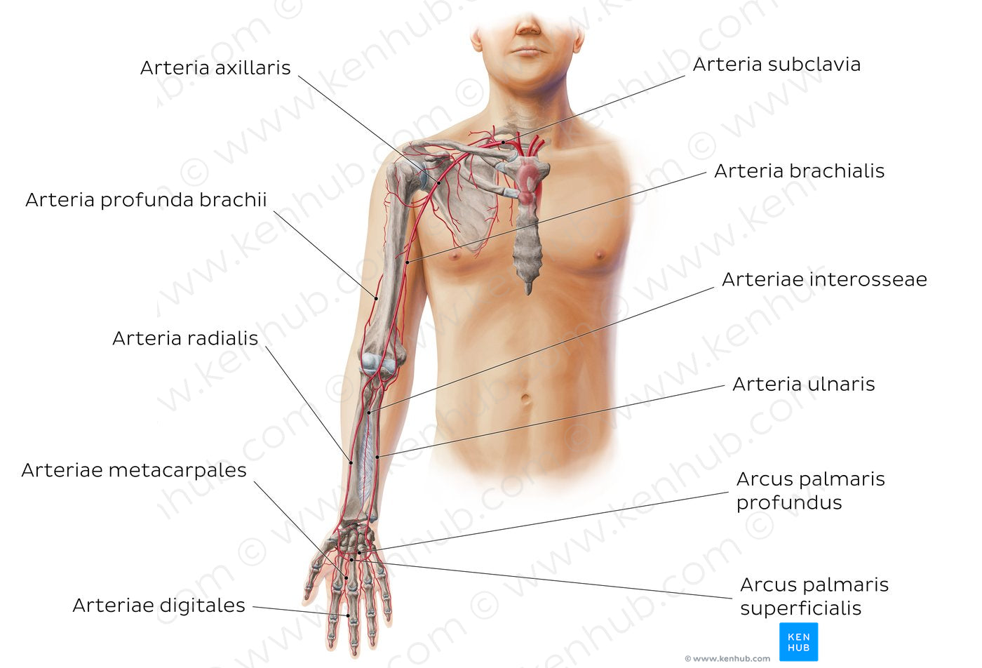 All blood supply to the membrum superius arises from the aorta and travels into the limb via the a. subclavia which then branches into smaller vasa that spread throughout the membrum superius, supplying each region with oxygenated blood.