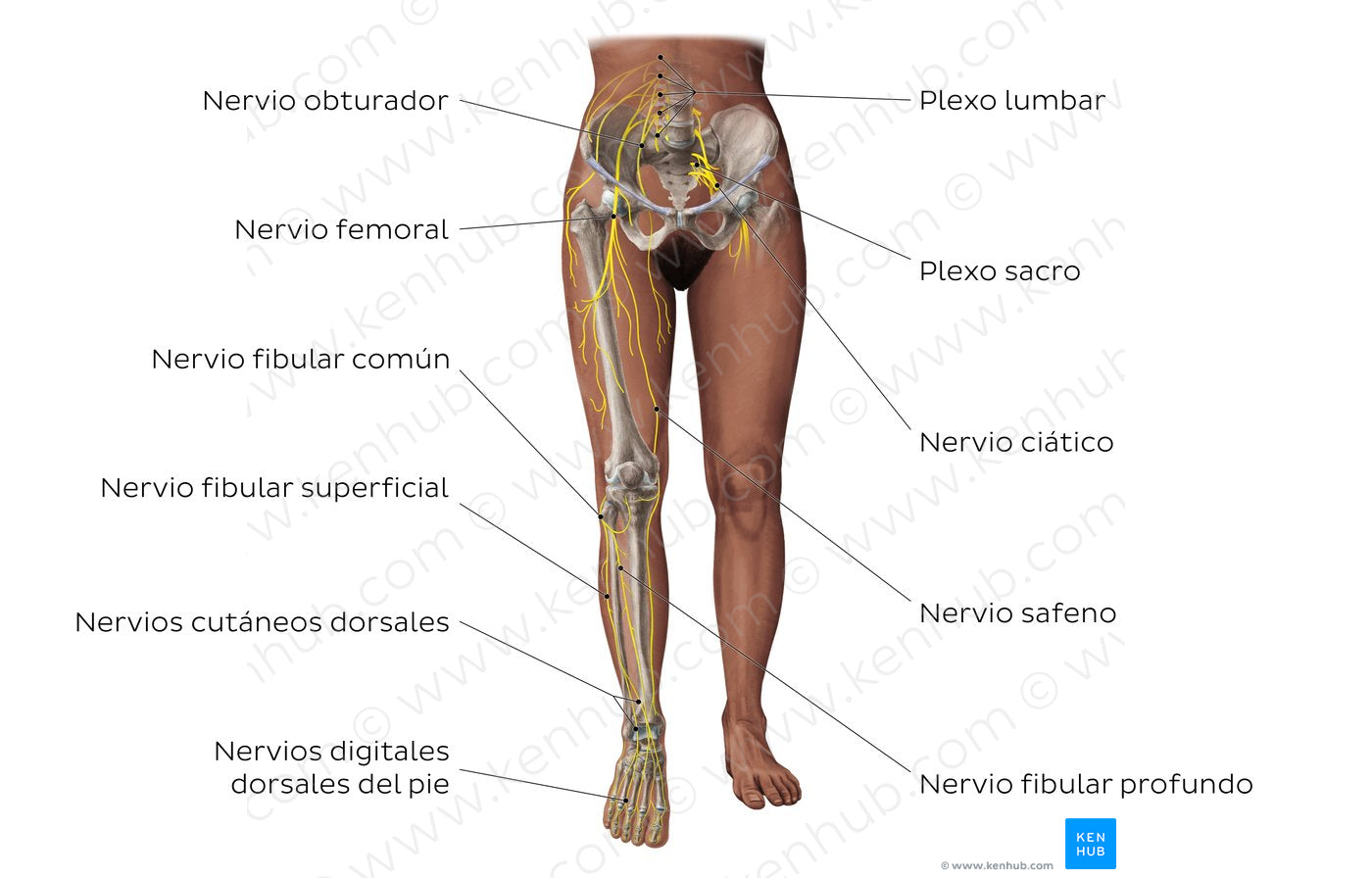 El principal nervio de la parte anterior del muslo es el femoral. Se origina del plexo lumbar y se extiende hacia la rodilla, suministrando la inervación motora a los músculos a lo largo de su trayecto. El segundo nervio principal es el nervio safeno. Es el ramo más grande del nervio femoral y se extiende hacia la cara medial del muslo, suministrando inervación sensitiva a la rodilla, pierna y pie.