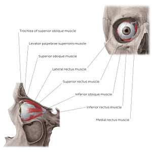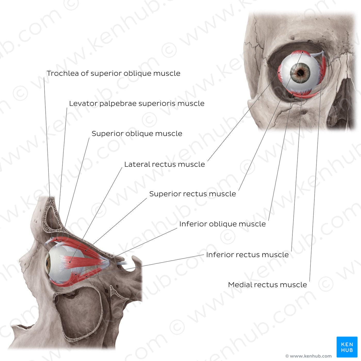 Lateral view of the left orbit (left image) and anterior view of the right orbit (right image) showing the positions of muscles of the orbit. The most superior muscle is the levator palpebrae superioris, originating from the lesser wing of the sphenoid bone and inserting on the superior tarsus and skin of the superior eyelid. Four straplike recti muscles (superior, inferior, medial and lateral rectus muscles) all originate from the common tendinous ring and run straight within the orbit to insert on the anterior half of the eyeball. The superior oblique muscle arises from the body of sphenoid bone and passes superomedially within the orbit, with its tendon running through the trochlea of the superior oblique, prior to inserting on the superior surface of the eyeball. The inferior oblique muscle is seen crossing the floor of the orbit below the inferior rectus muscle after arising from the maxillary bone, to insert on the inferior surface of the eyeball below the lateral rectus muscle.
