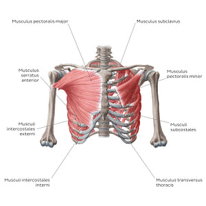 The mm. externi of the thoracic wall include the m. subclavius, m. pectoralis major and m. pectoralis minor and m. serratus anterior. The short, triangular m. subclavius is located beneath the clavicula and mainly functions in anchoring and depressing the bone. The large m. pectoralis major arises from three heads (pars clavicularis, pars sternocostalis and pars abdominalis) which unite before inserting into the sulcus intertubercularis of the humerus. Deep to the m. pectoralis major, is the smaller m. pectoralis minor. The m. pectoralis major primarily flexes, adducts and internally rotates the arm at the articulatio glenohumeralis on contraction, while the m. pectoralis minor stabilizes and draws the scapula anteroinferiorly. Located along the anterolateral aspect of the thoracic wall is the large fan shaped m. serratus anterior. This muscle primarily functions to rotate and draw the scapula anterolaterally. All of the mm. externi of the thoracic wall participate in elevation of the costae during forced inspiration as a secondary function.The mm. interni evident from this anterior view include the mm. intercostales, mm. subcostales and m. transversus thoracis. Lying beneath the large mm. externi of the thoracic wall are the mm. Intercostales (mm. intercostales externi, mm. intercostales interni and mm. intercostales intimi). These muscles are located within the spatia intercostalia and function to elevate, stabilize or depress the skeleton thoracis and therefore facilitate breathing movements. The mm. subcostales are bands of muscle located on the facies interna of the costae inferiores, sharing a plane with the mm. intercostales interni. They support the spatia intercostalia and skeleton thoracis, and depress the costae during forced expiration. Also located along the internal aspect of the thoracic cage is the m. transversus thoracis. This is a weak muscle of the skeleton thoracis which assists in expiration.