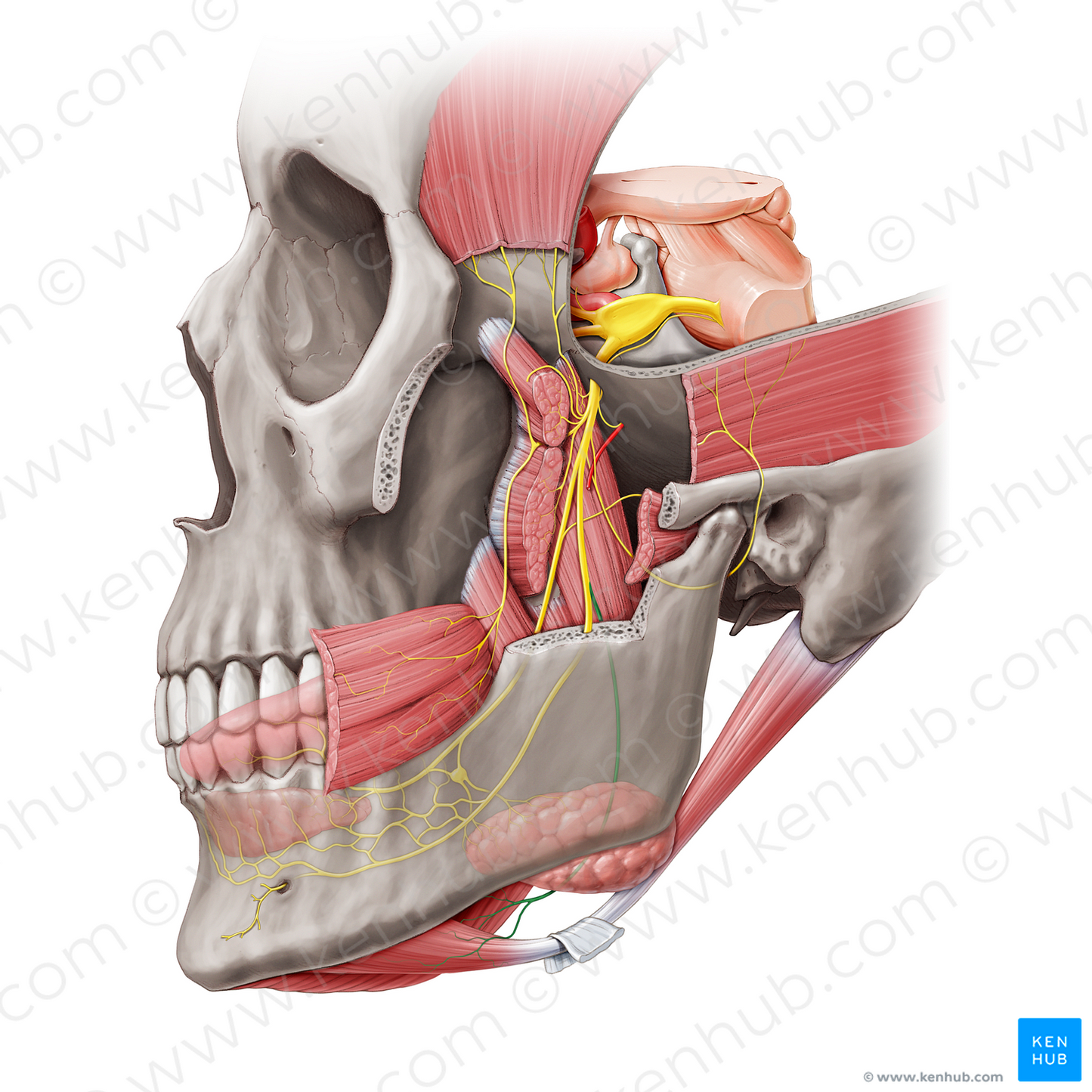 Shown from lateral left perspective. Also known as Mylohyoid nerve.