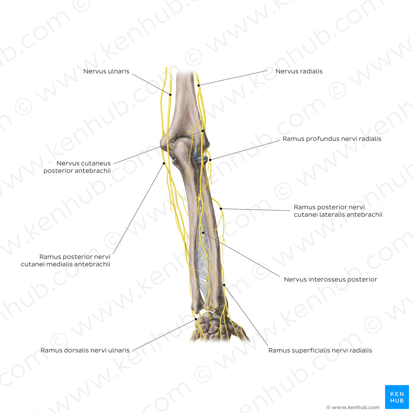 The n. radialis divides into a r. superficialis and r. profundus just anterior to the epicondylus lateralis humeri. The r. superficialis descends along the anterior forearm curving around the radius between the mm. brachioradialis and pronator teres to enter the posterior distal third of the forearm. The r. profundus nervi radialis exits the fossa cubitalis and enters the posterior forearm by passing between the caput humerale/ulnare of the m. supinator. At this point it becomes known as the n. interosseus posterior. This nerve provides motor innervation to muscles of the posterior forearm. The n. cutaneus posterior antebrachii posterior arises from the n. radialis in the compartmentium posterius of the arm and descends distally to provide cutaneous innervation to the skin of the posterolateral forearm. Rr. posteriores of the n. cutaneus medialis/lateralis antebrachii also contribute to the cutaneous innervation of the posterior forearm.