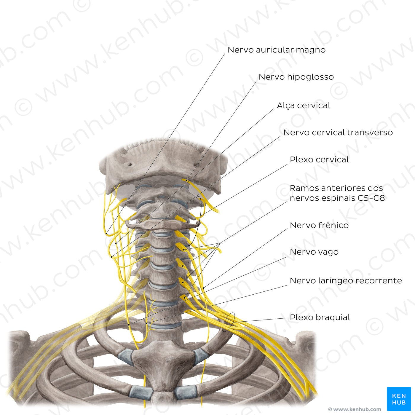 O plexo cervical está localizado na porção superior do pescoço e é formado pelos ramos anteriores dos nervos espinais C2-C4. O plexo cervical emite vários ramos superficiais e profundos. Os ramos profundos incluem a alça (ansa) cervical, os ramos musculares do plexo cervical e o nervo frênico; exemplos de ramos profundos incluem os nervos occipital menor, auricular magno, cervical transverso e supraclavicular. O nervo glossofaríngeo (NC IX) desce entre a artéria carótida interna e a veia jugular interna para inervar estruturas internas da cabeça e do pescoço, enquanto o nervo vago (NC X) desce em direção ao tórax, emitindo os nervos laríngeos superior e recorrente durante o trajeto. O nervo acessório (NC XI), juntamente com contribuições dos nervos espinais C3/4, desce pelo aspecto posterior do pescoço para chegar ao músculo trapézio no dorso. Finalmente, o nervo hipoglosso (NC XII) não emite ramos no pescoço, seguindo para inervar estruturas internas da cabeça.